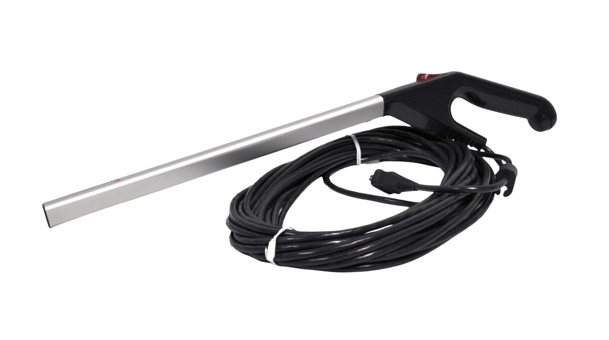 Metal vacuum handle assembly with tube, power switch, and power cord with cord strain relief and cord retainer grip.