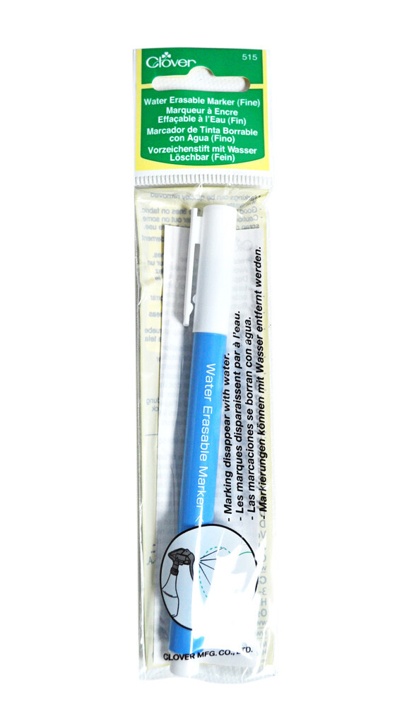 Clover Water Soluble Fabric Marker Fine Blue Blue fine fabric marking pen. Water erasable. Great for planning sewing projects, works great on light and dark fabrics. Giving you enough time to finalize the details. Easy to see markings, disappear when washed with water. Extra fine durable point for precise results. Naturally disappears in 2 to 7 days. CHK-515CVC