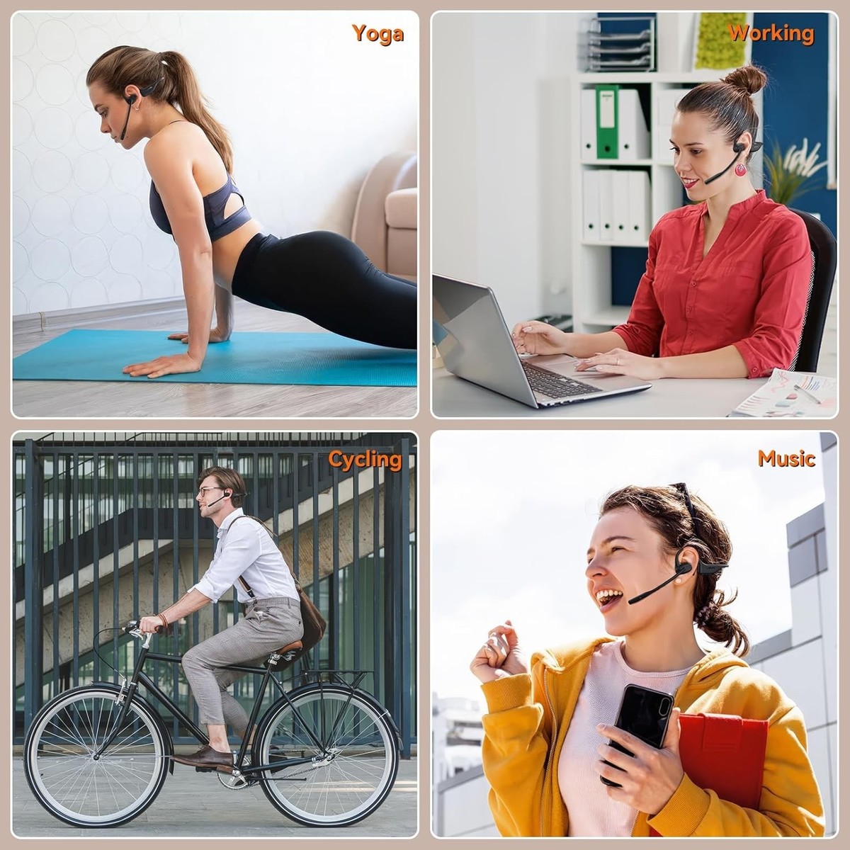Ultra-Light Comfort: With a featherweight design of just 29 grams, wireless headset with mic for work are built for long-lasting comfort. The skin-friendly silicone pads and ergonomic fit provide a secure hold that stays in place, and have been tested to stay in place even during high-intensity activities, eliminating the hassle of frequent adjustments. Whether you're cycling, hiking, or wearing a helmet and glasses, bluetooth headset with mic offers all-day ease without slipping