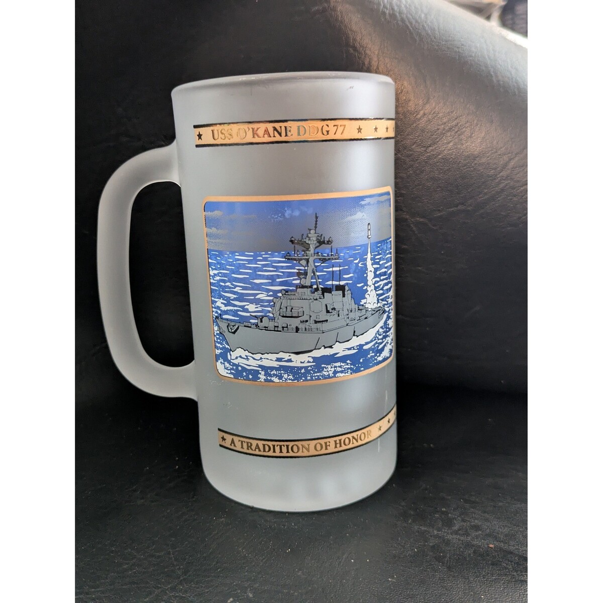 Mots cles : USS O'Kane, DDG 77, souvenirs de la marine, objet de collection militaire, chope de biere, tasse en verre depoli, tasse de navire naval, classe Arleigh Burke, navire destroyer, cadeau patriotique, decoration nautique, verrerie