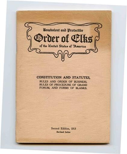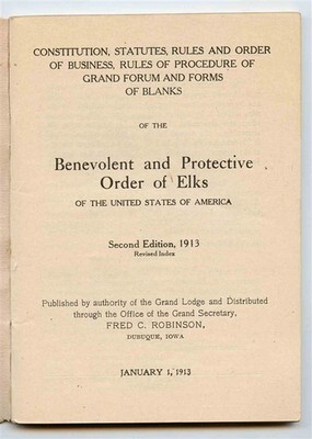 A 124 page soft cover Booklet. Benevolent Protective Order of Elks of the United States Constitution Statutes Booklet . Rules and Order of Business, Rules of Procedure of Grand Forum and Forms of Blanks. Second Edition, 1913, with revised index. Published by Authority of the Grand Lodge.