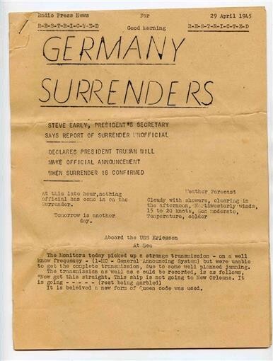 Original Aboard U S S Ericsson at Sea Newspaper Germany Surrenders 29 April 1945