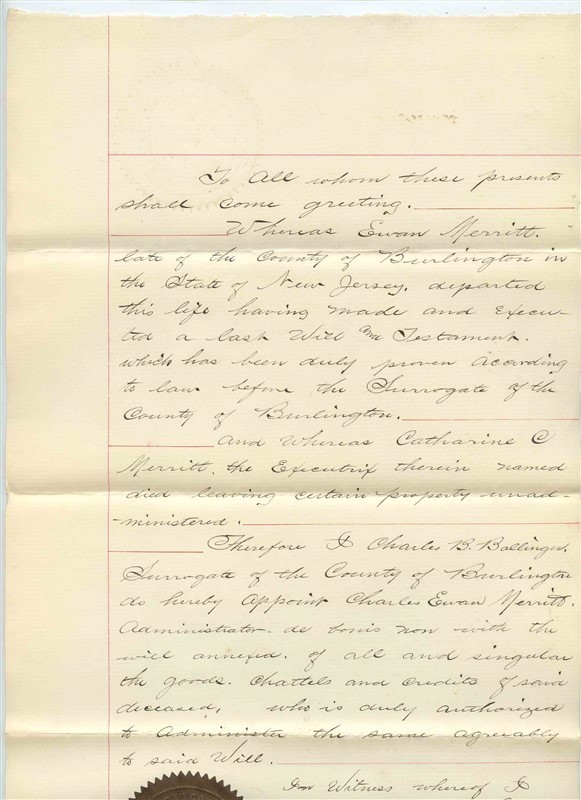 1894 State of New Jersey Willed Administrator Letter with Seal