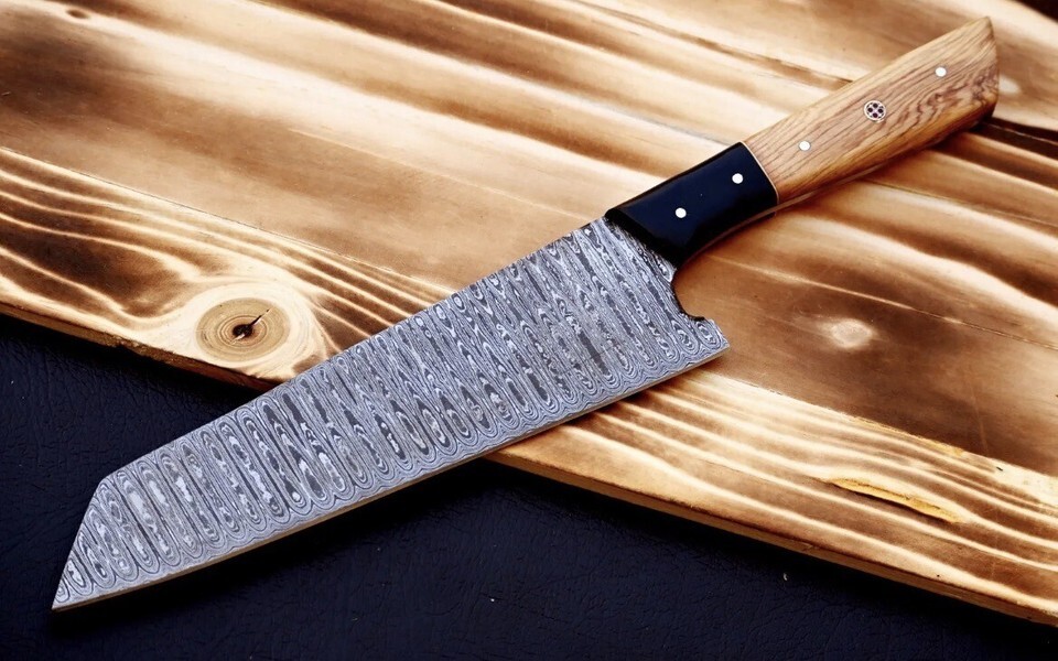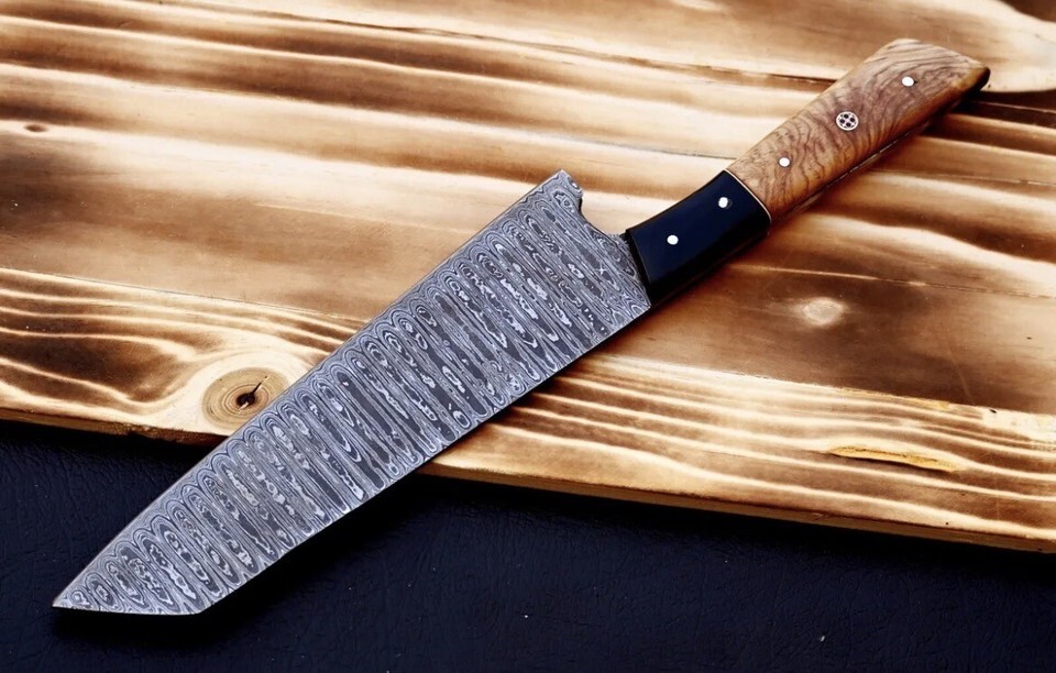 Introducing the 13? Handmade Damascus Chef Knife, a versatile and high-quality addition to your kitchen. This Japanese Bunka kitchen knife is made with care and precision, using wood, cast iron, and carbon steel materials. The blade is straight-edged and 8? in length, perfect for cutting a variety of foods, from vegetables to meat.
