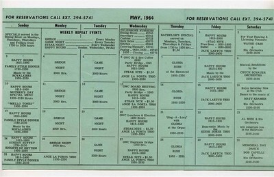 Lowry Air Force Base Officers Open Mess May 1964 Club News . With monthly schedule of activities , club information and more.