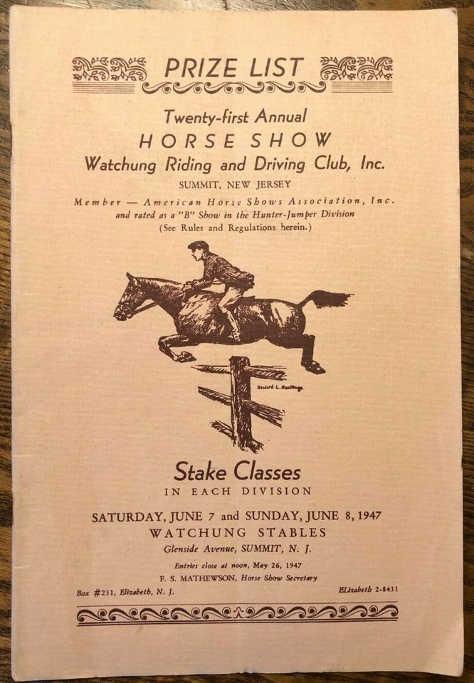 WATCHUNG STABLES (NJ) 21st Annual HORSE SHOW 20-page Prize List June 7-8, 1947