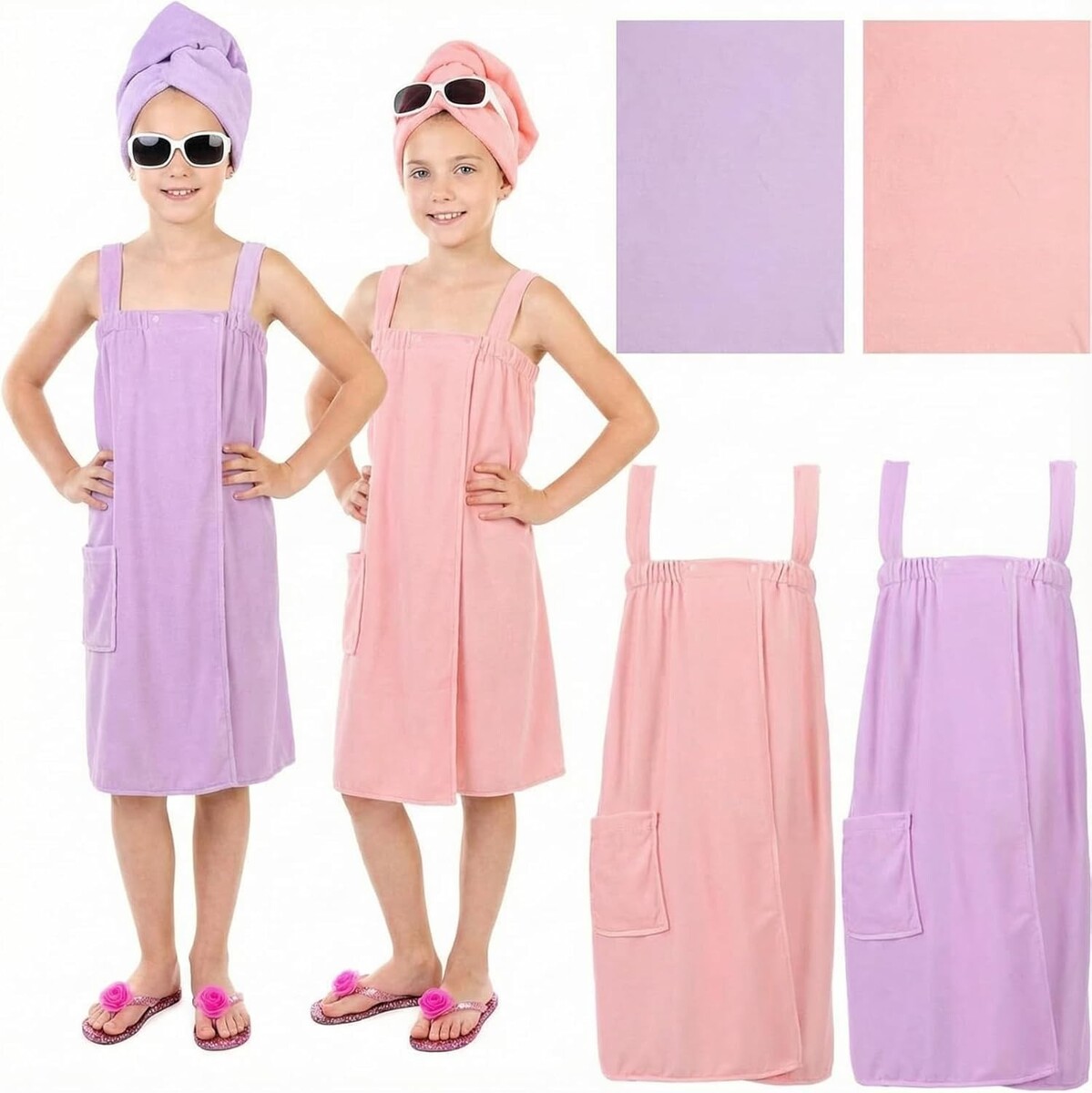 Set includes 2 plush bath towel wraps and 2 stylish kids hair towels.