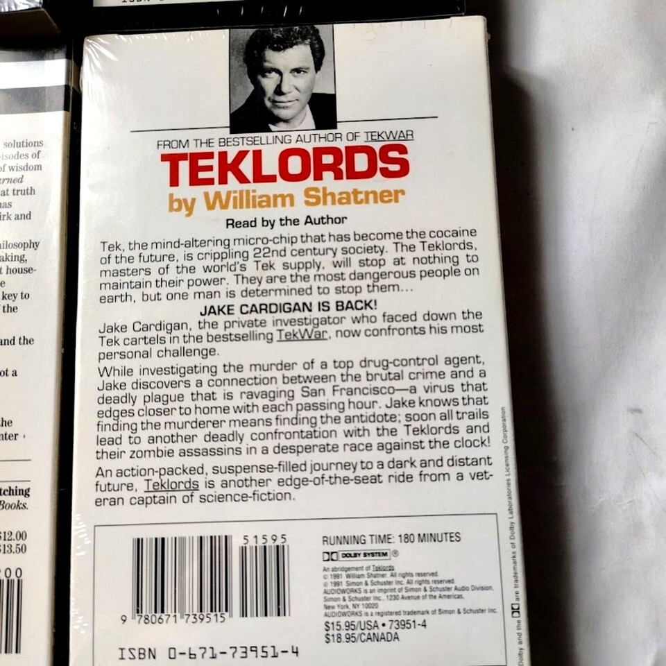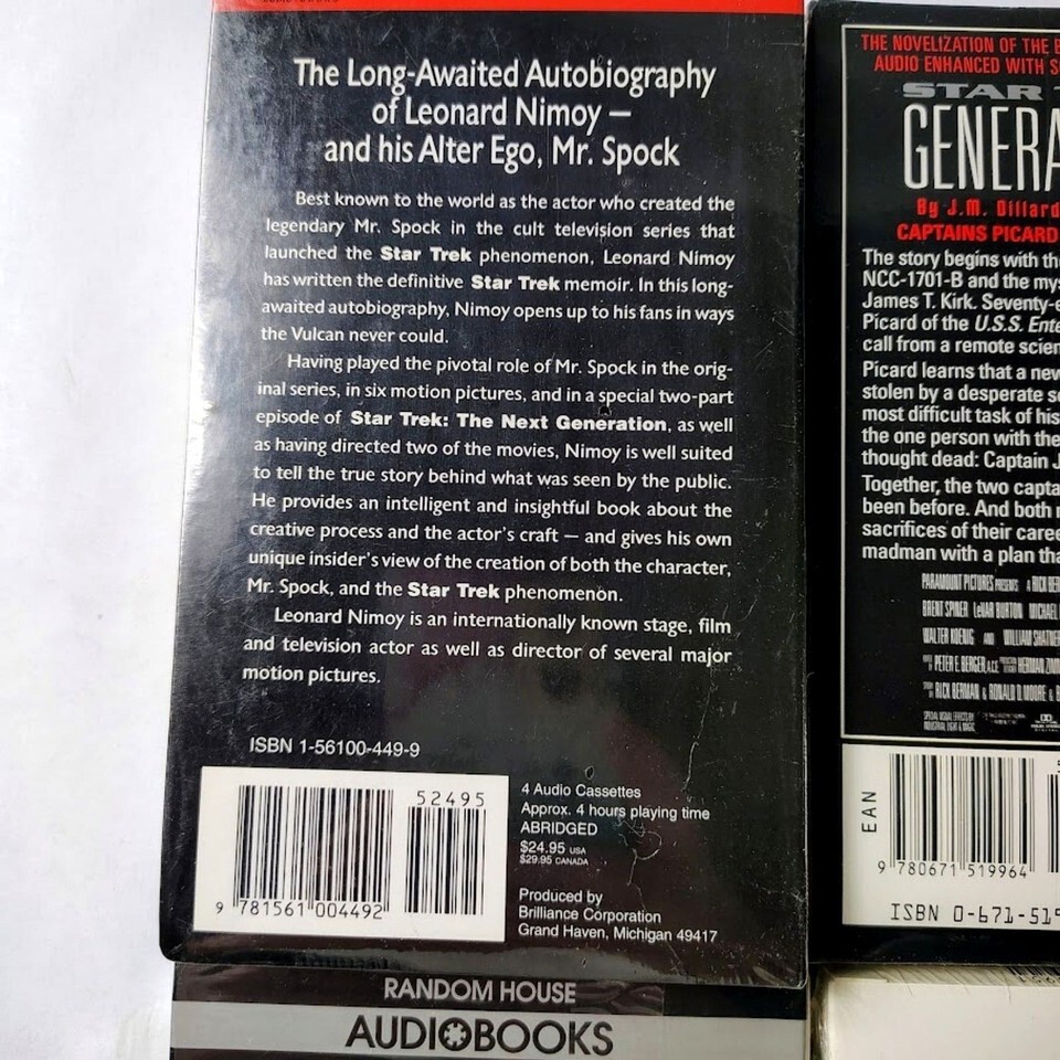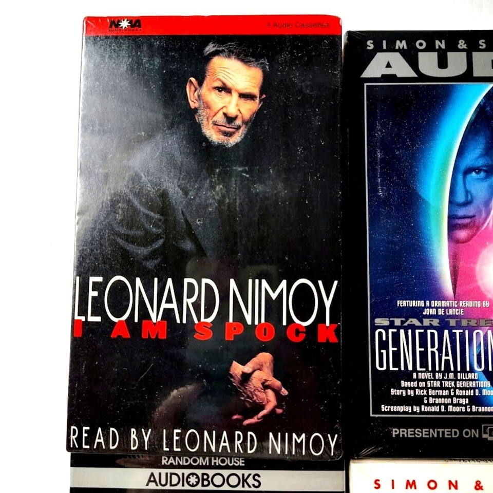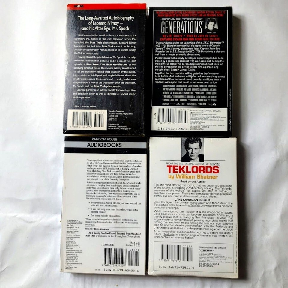 4 New Star Trek Related Audiobooks on Cassettes Vintage Sealed. William Shatner TekLords, Generations, Leonard Nimoy I Am Spock, and All I really need to know I learned from watching Star Trek. No tags.