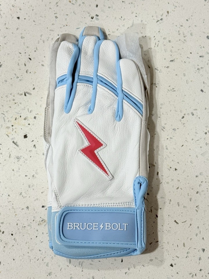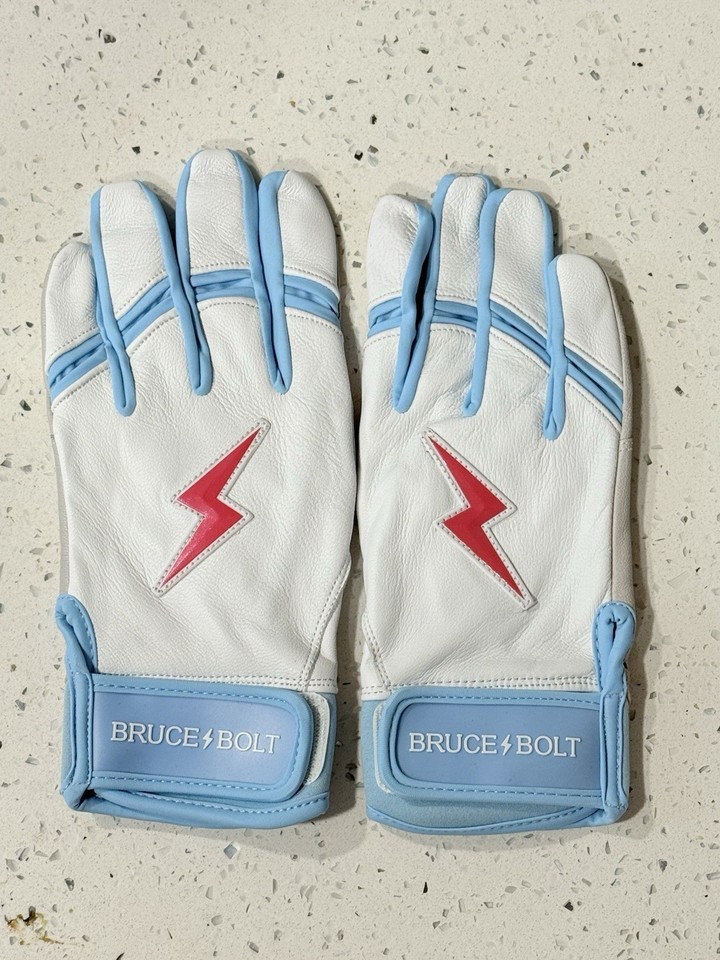 BRAND NEW YOUTH BRUCE BOLT WHITE & BABY BLUE PREMIUM BATTING GLOVES YOUTH LARGE