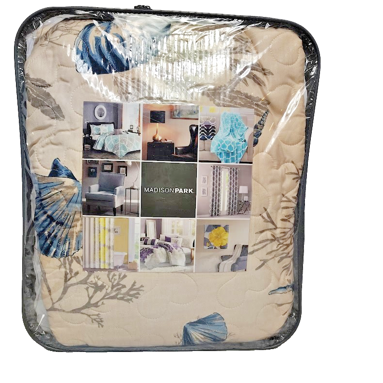 The Madison Park Daybed Cover Set in Seashell Blue features a beautiful quilted design with a beach-themed pattern of seashells. Made from 100% polyester fill and polyester/cotton blend material, this set includes a cover, bedskirt, decorative pillow, and three shams. The set has dimensions of 75 x 39 inches, perfect for a daybed, and comes in a stylish seashell blue color. The Madison PARK brand ensures quality and the set is ideal for adding a coastal touch to your bedroom decor.