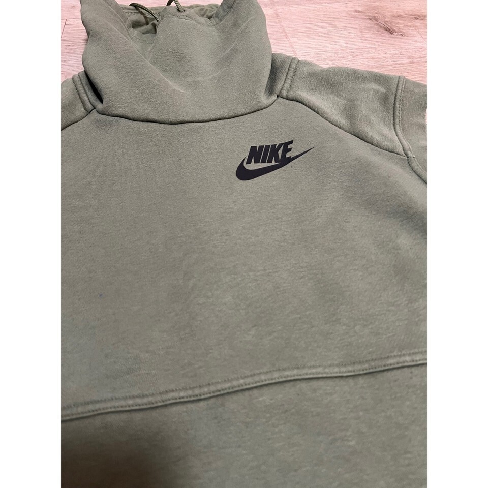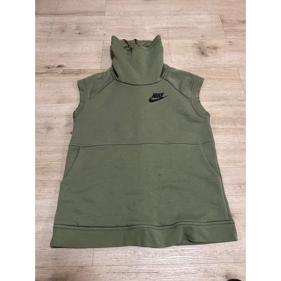 Elevate your athleisure style with this Nike sleeveless hoodie, a versatile piece that blends comfort and modern design. The olive green hue exudes a subtle, earthy vibe, while the iconic Nike swoosh adds a touch of sporty authenticity. This pullover sweatshirt features a cozy, high-neck hood with adjustable drawstrings, perfect for layering or providing extra warmth on cooler days. The convenient front pocket offers a practical place to keep your essentials or warm your hands. Imagine yourself wearing this stylish hoodie for a casual weekend brunch, a light workout at the park, or simply lounging at home in ultimate comfort.