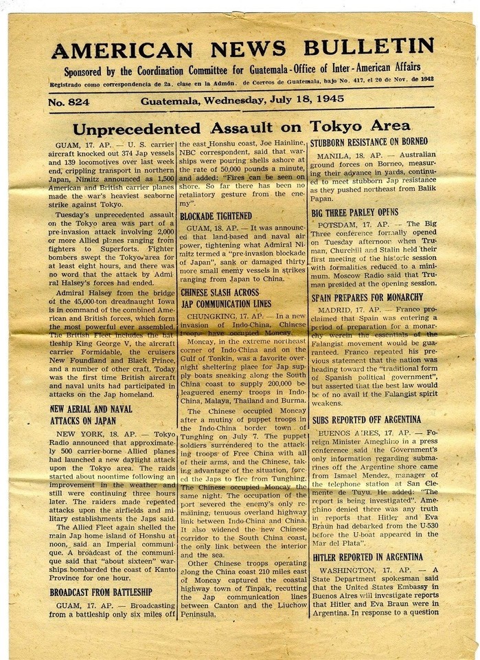 American News Bulletin Guatemala Inter American Affairs 1945 Assault on Tokyo