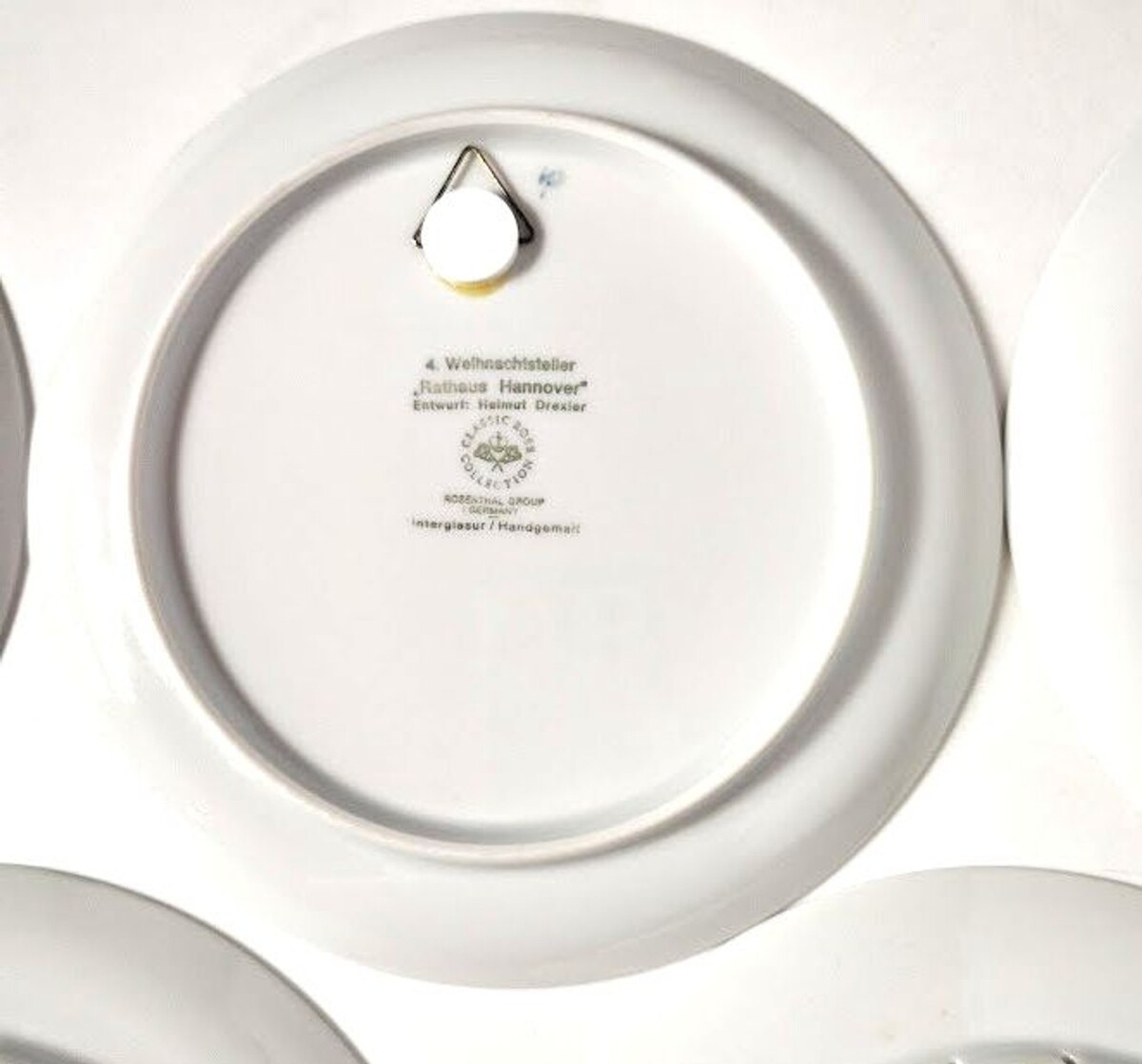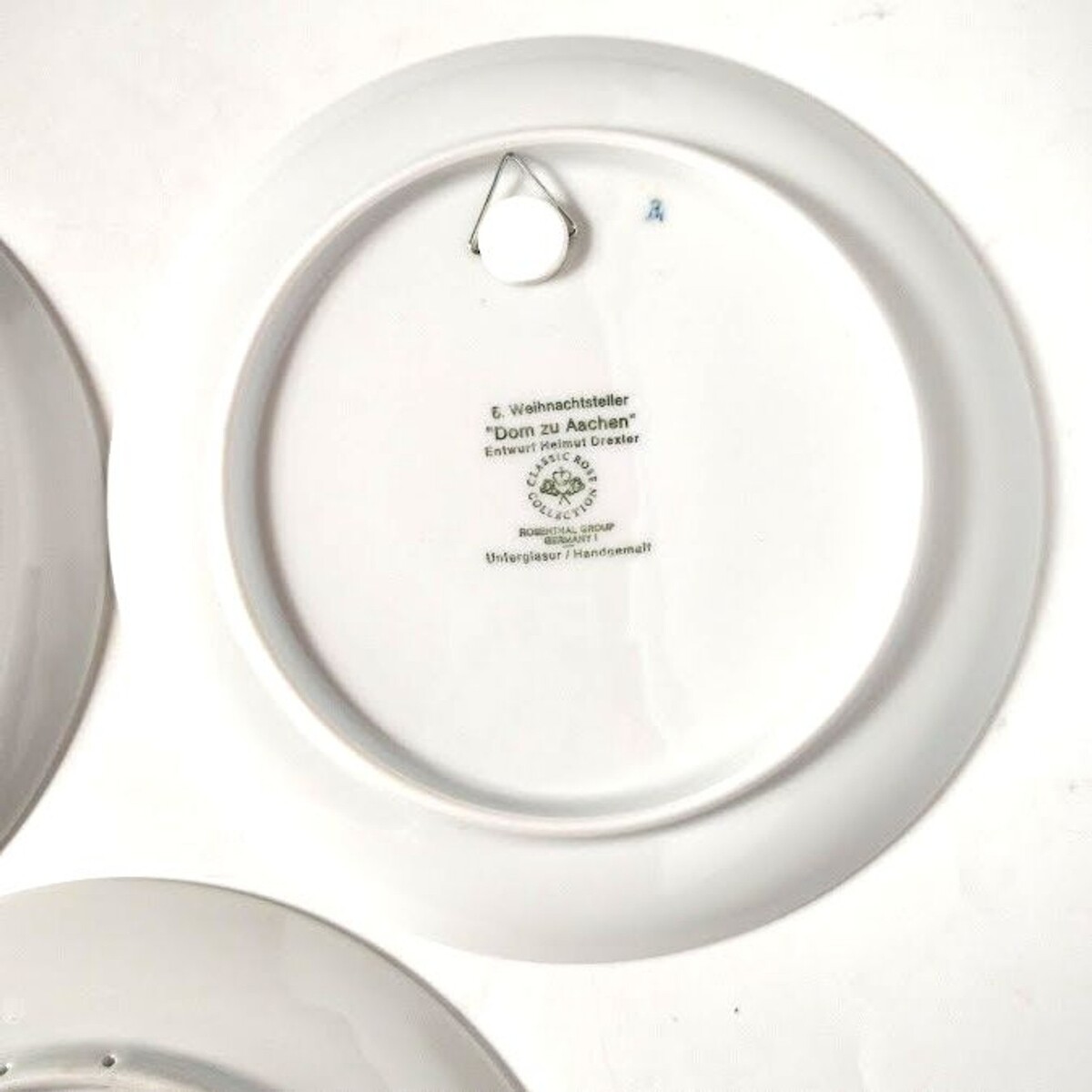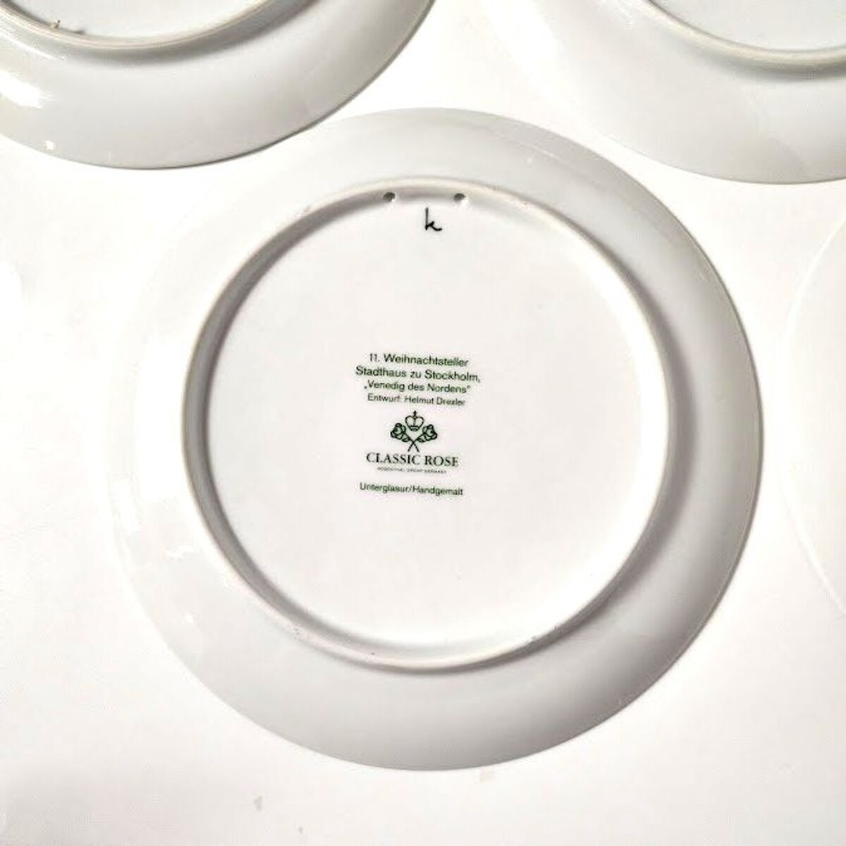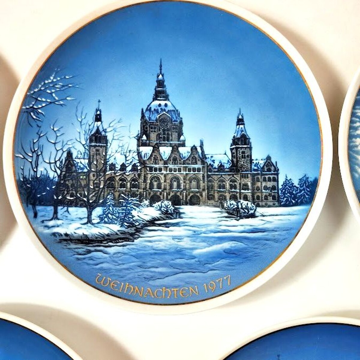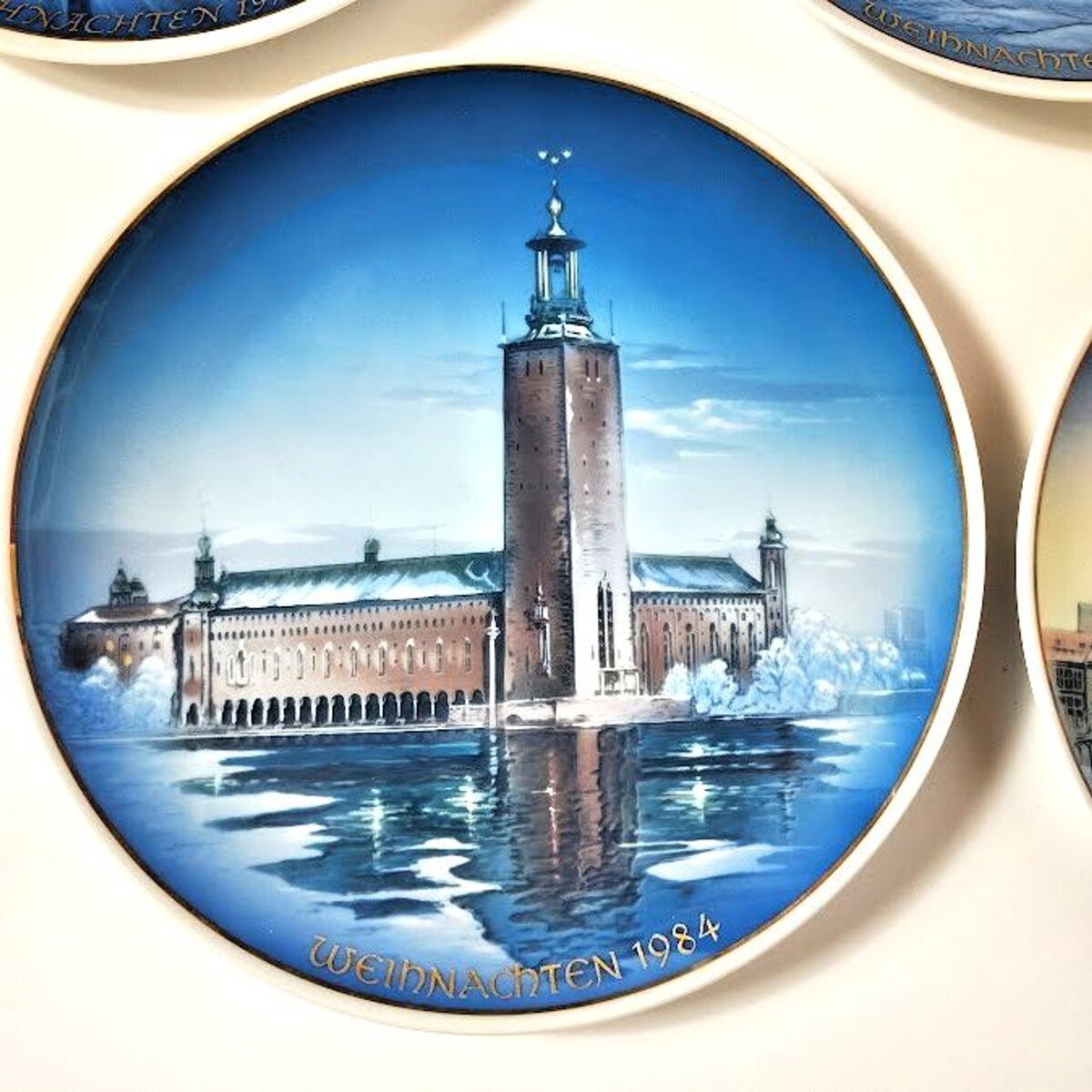 This set of 5 Weihnachten Christmas collector plates is a special addition to any collector's display. Hand-painted on porcelain with a beautiful blue color, these vintage plates from Germany showcase the craftsmanship of the late 20th century. Designed by Helmet Drexler and produced by Rosenthal Group, these decorative collector plates feature traditional German Christmas motifs, making them a charming and unique addition to your holiday decor or collector's showcase. Each plate measures 8.5 inches in diameter, and their production style of art pottery adds a touch of elegance to any collection. All from 1970s 80s. Scenes are Aachen Cathedral, Hanover Town Hall, Freiburg Munster, Stockholm City Hall "Venice of the North", and Amsterdam.