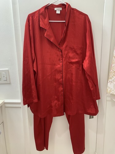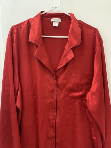 This Jones New York Women's Long Sleeve Pajama Top Pant Set in Plus Size 3X is a stylish and comfortable sleepwear option. Made from red satin polyester material, this set features a solid pattern with a collared neckline and button closure. The lightweight design is perfect for all seasons, and the vintage designer brand adds a touch of luxury to your bedtime routine. Ideal for a cozy and fashionable night's sleep. Red with a black trim. So cozy and fashionable. New with tag.