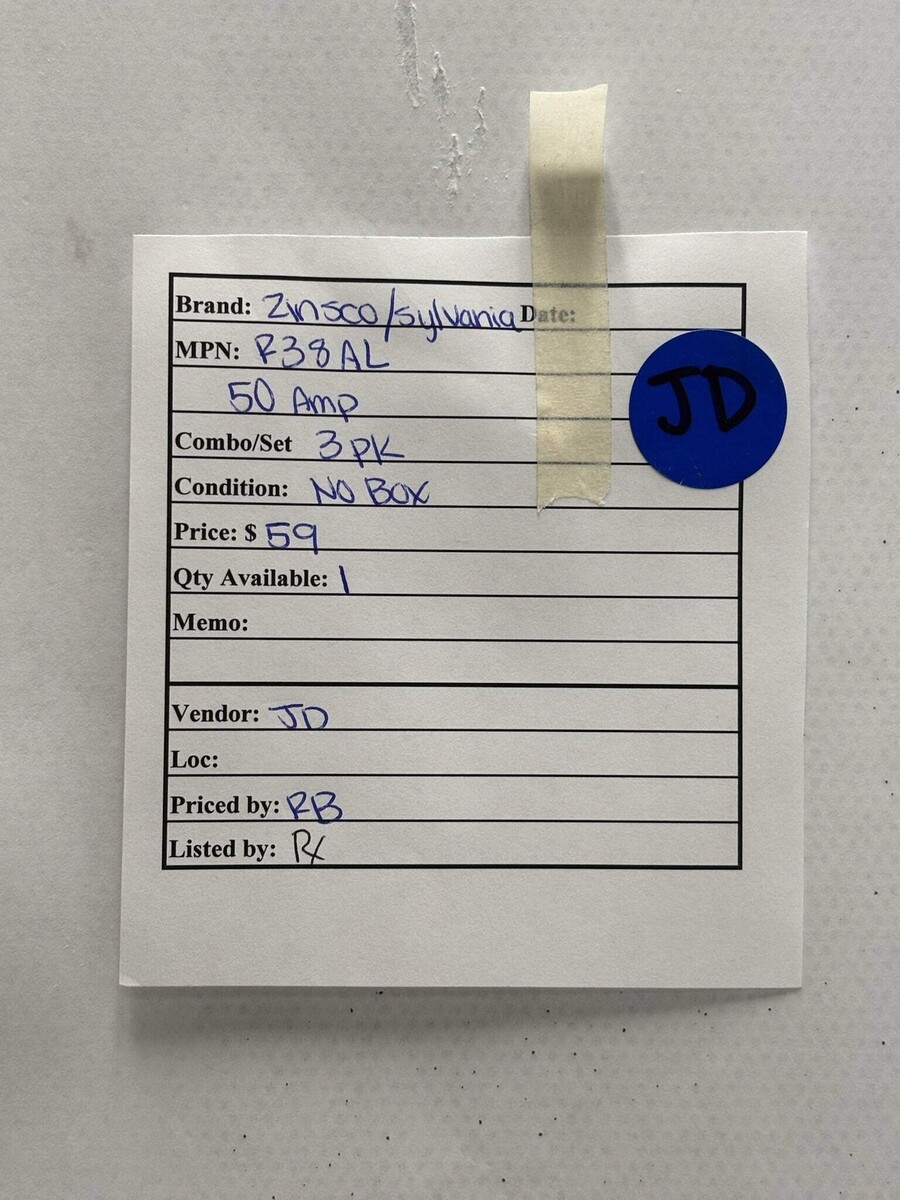 3 Pk Zinsco/Sylvania R38AL 50 Amp 2-Pole 120/240 V Circuit Breaker for Panels New - No Box The Zinsco/Sylvania R38AL 50 Amp circuit breaker is a 2-pole thermal magnetic breaker designed for overcurrent protection in 120/240 V electrical systems commonly found in older residential panels. This breaker clips or plugs into compatible Zinsco or Sylvania electrical panel load centers to help interrupt fault currents and protect wiring and devices. Listed by: Richard (Sales Team) ?The road to success has many potholes... knowing how to dodge them ahead of the collision will pave our way in reaching our journey.? R. Weckworth (A positive moment brought to you by Help Resale) About Us Welcome to Help Resale, your go-to consignment shop where value meets quality. At Help Resale, we're dedicated to providing you with an exceptional shopping experience, whether you're looking to find the best deals or consign your items. Need to buy a product, but don't see it in our store? Please feel free to reach out to us and we will help you find it! Help Resale 7200 Fair Oaks Blvd Suite 120 Carmichael CA 95608 Business Hours: Monday-Friday: 9:00 am to 5:00 pm (PST) All product and company names are trademarks TM or registered trademarks of their respective holders. Use of them does not imply any affiliation with or endorsement by them.