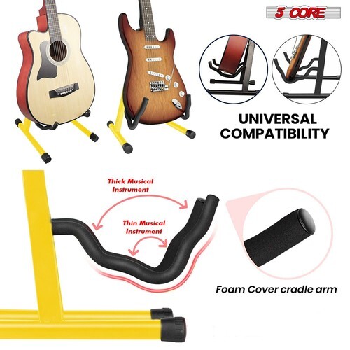 Universal Compatibility - With a 12-inch max leg width and 8-inch arm length, this foldable stand fits various instruments such as acoustic guitars, electric guitars, basses, ukuleles, and banjos.