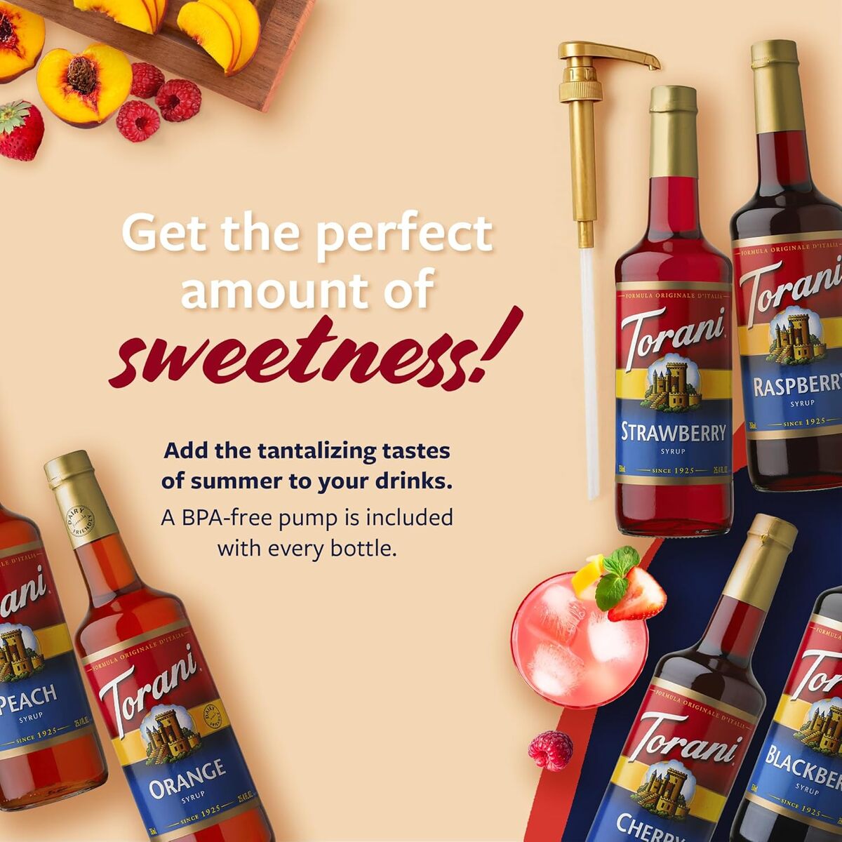 Torani Fruit Syrup Variety 6-Pack, Strawberry, Peach, Raspberry, Blackberry, Orange, and Cherry Flavoring for Drinks, Pumps Included