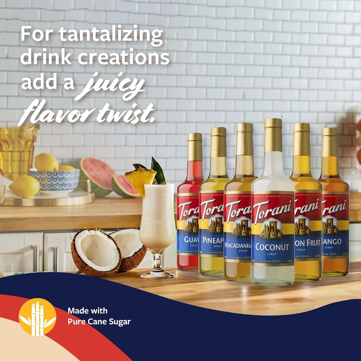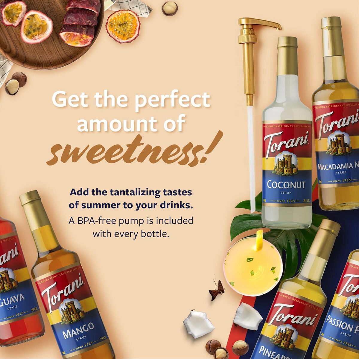 Torani Hawaiian Lovers Syrup Variety 6-Pack, Macadamia Nut, Pineapple, Coconut, Mango, Guava, and Passion Fruit Syrup for Drinks, Pumps Included