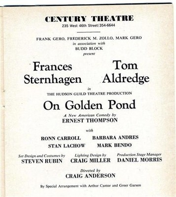 A Showbill for On Golden Pond from a performance in 1979 at the Century Theatre in New York City. In fine condition. Starring Frances Sternhagen and Tom Aldredge.