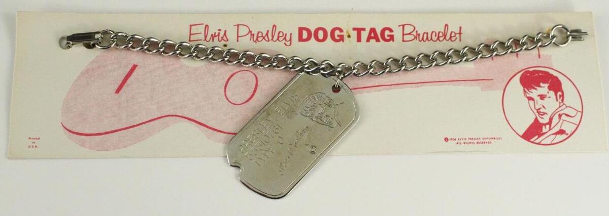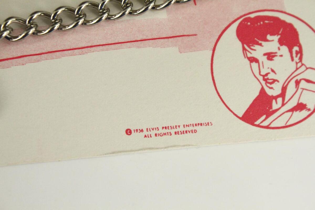 Details: Still on the original card. From the living estate of Rosalind Cranor - The author of the Elvis Collectibles Book. Dog tag bracelet. Card is dark pink and white. Matches the bracelet featured on page 17 of the 2nd edition Elvis Collectible book. 7" long. The card has light browning. The dogtag is 1" long.