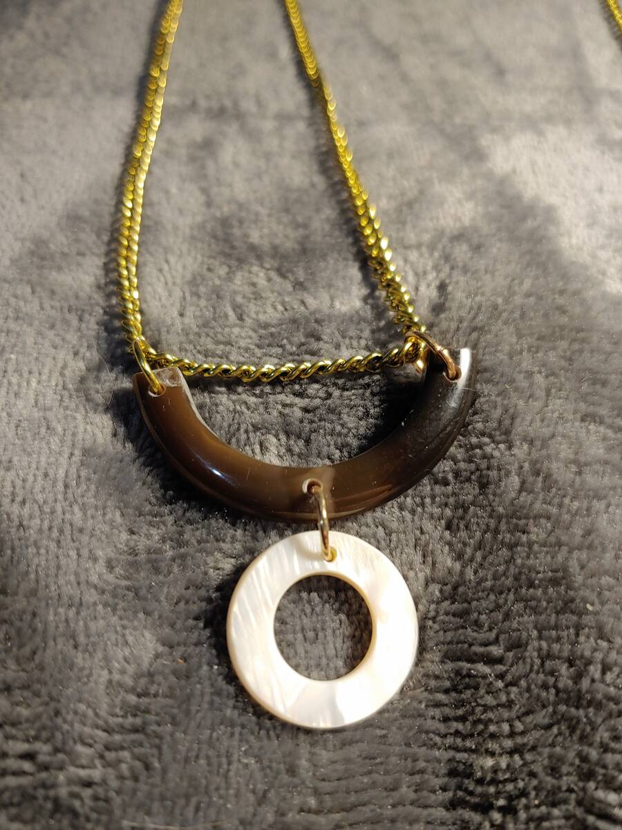 * The half circle with the white circle necklace is about 13.5-14 inches and weighs about .49 ounces.