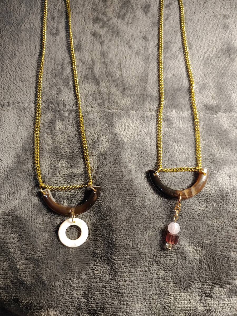 * The half circle with beads necklace which is about 13.5-14 inches and weighs about .46 ounces.