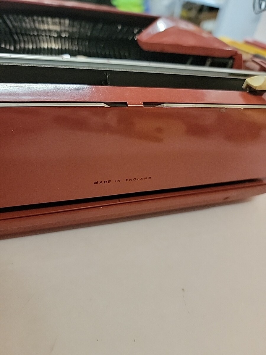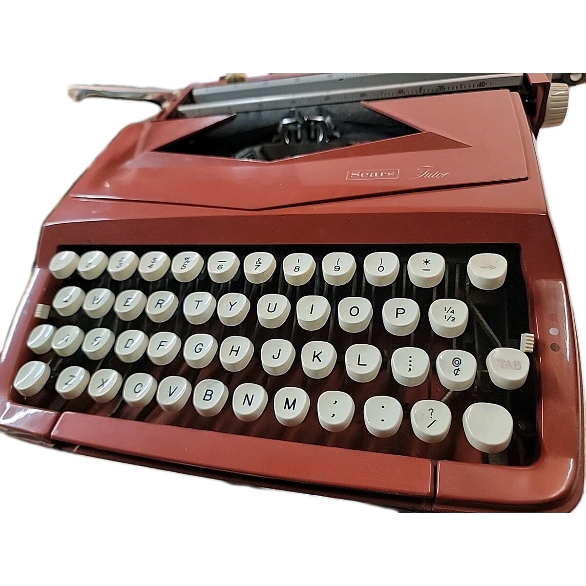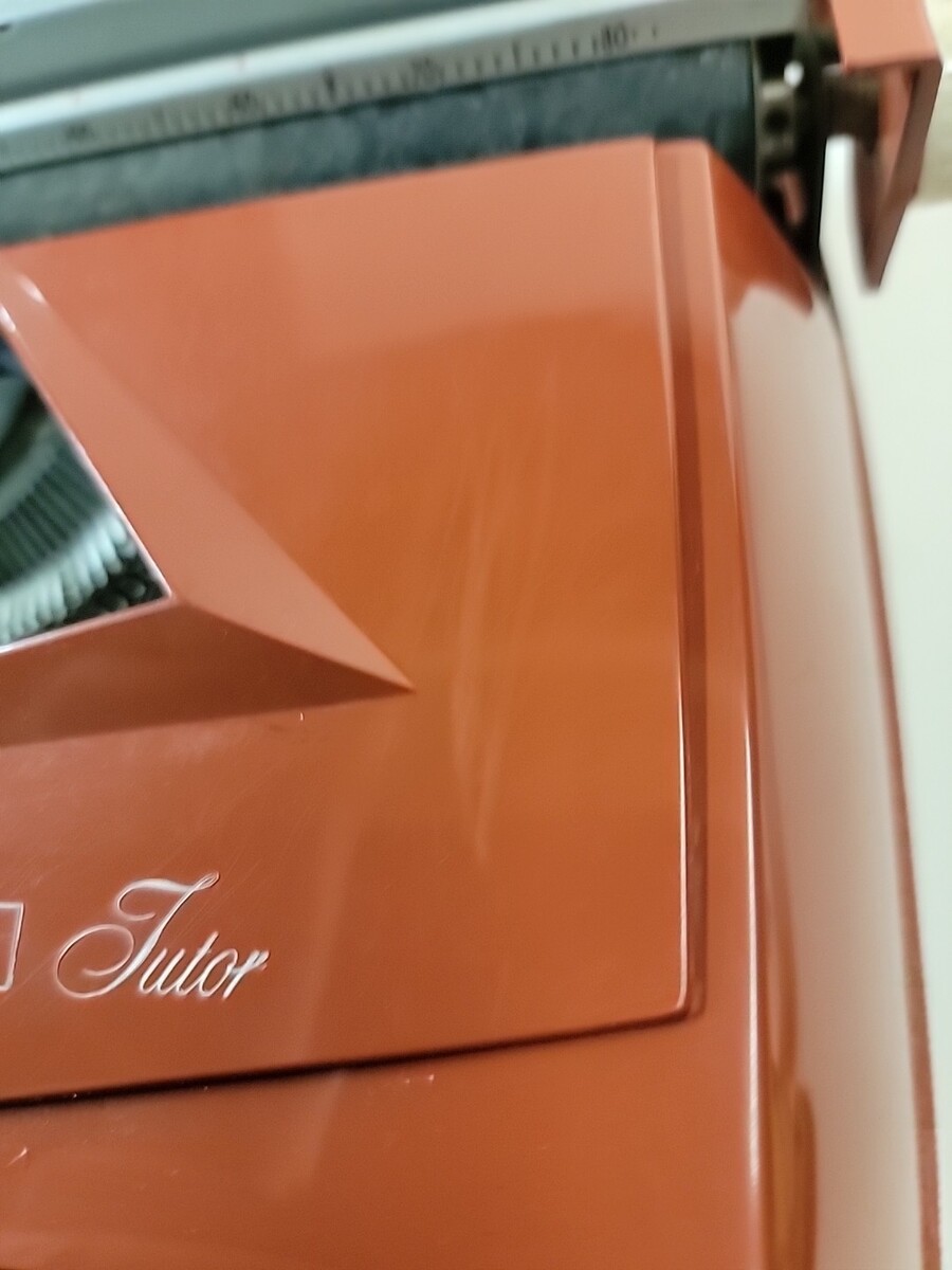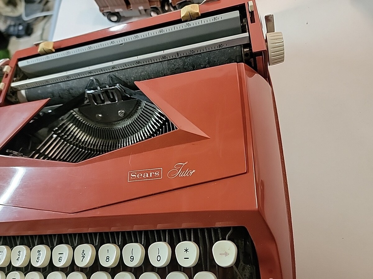 This vintage 1960s Sears Tutor Portable Typewriter in a burnt orange color comes with its original case. Made of plastic, this typewriter was manufactured in England and is a single unit. Its retro style and post-1940 age make it a unique and collectible piece for antique enthusiasts. Perfect for those interested in vintage technology or typewriter history, this portable typewriter is a rare find from the 1960s.