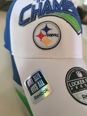 The Pittsburgh Steelers Reebok Super Bowl XLIII Locker Room Hat features the official team logo and colors, making it a must-have for any Steelers fan. This cap is a replica of the one worn by players in the Super Bowl, making it a special piece of memorabilia for fans of the team. With its one size fits all design, this hat is perfect for showing support for the Pittsburgh Steelers in style. Has a blemish in that the Steelers patch round logo is upside down see pics hat is never worn still has cardboard inside mint