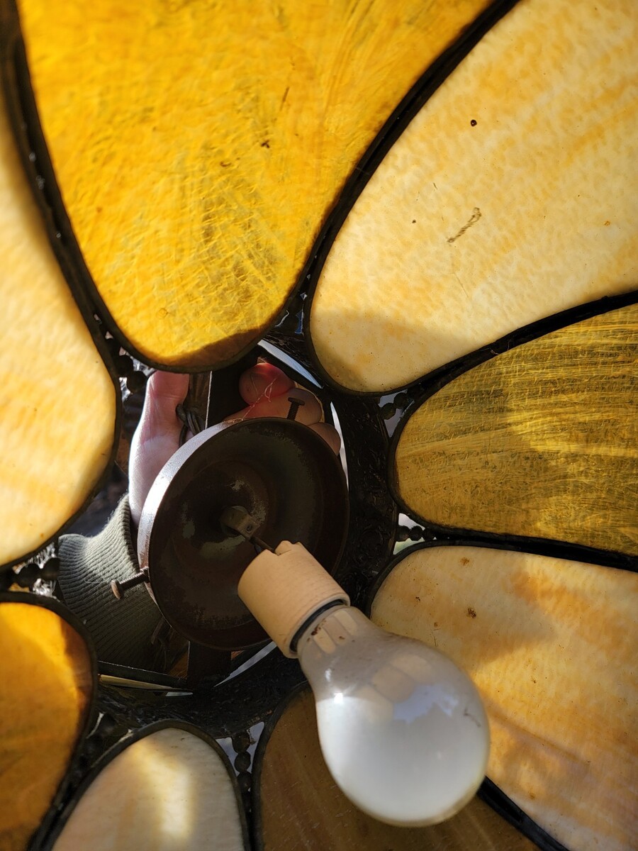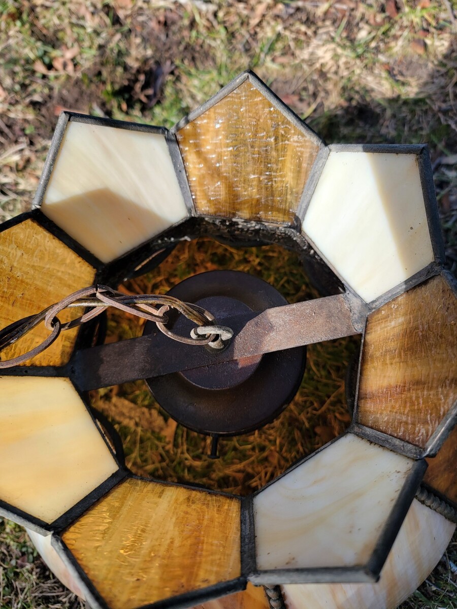 Beautiful glass hanging lamp comes with original socket and mount but not tested and may need work to hang,glass is chip free .See pics.