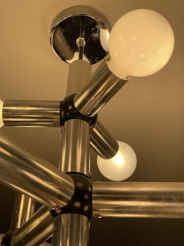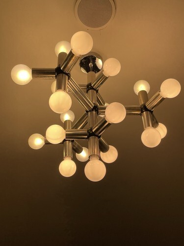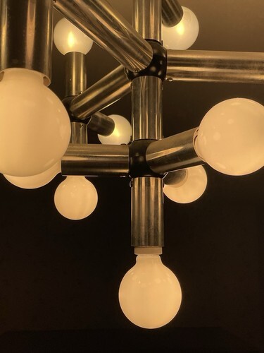 I am selling on behalf of the owner a contemporary 19 light vintage 1970?s Molecule chandelier we believe was designed by either Robert Haussmann or Robert Sonneman for perhaps the Lightolier company. This chandelier is not labeled Lightolier, but another one belonging to the same owner that complements this one, is labeled Lightolier. The light has 19 regular sized socket bulbs. Bulbs not included.