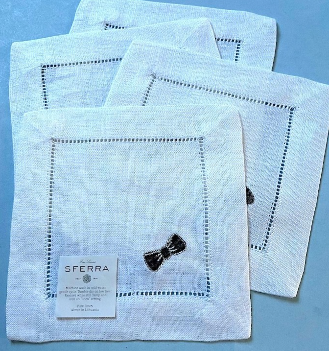 Sferra Linen Cocktail Napkin w/Bowtie Embroidery & Silver Accents 6x6" Set/4 New