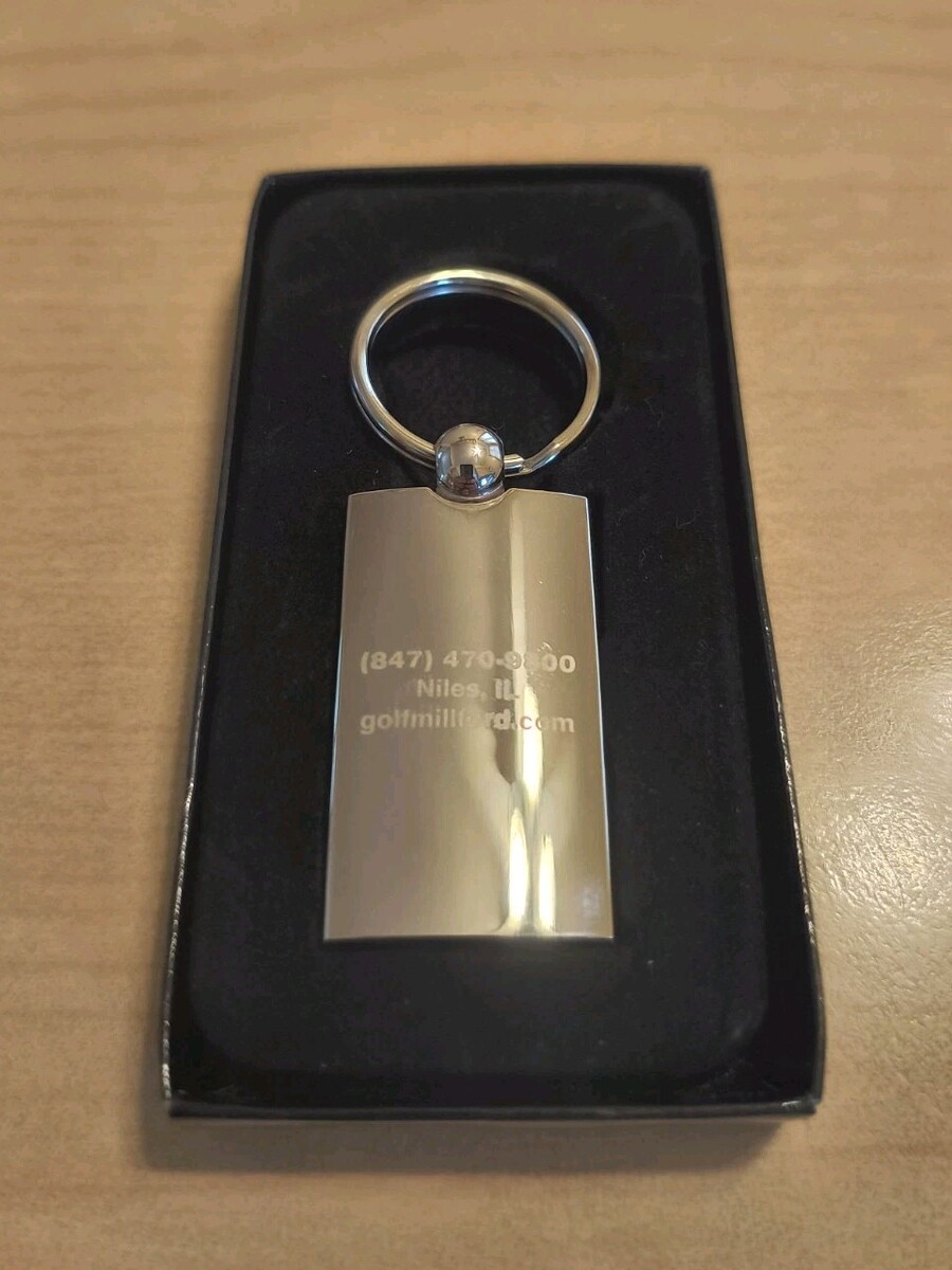New Golf Mill Ford keychain in a small black box. It is one inch wide and three inches long.
