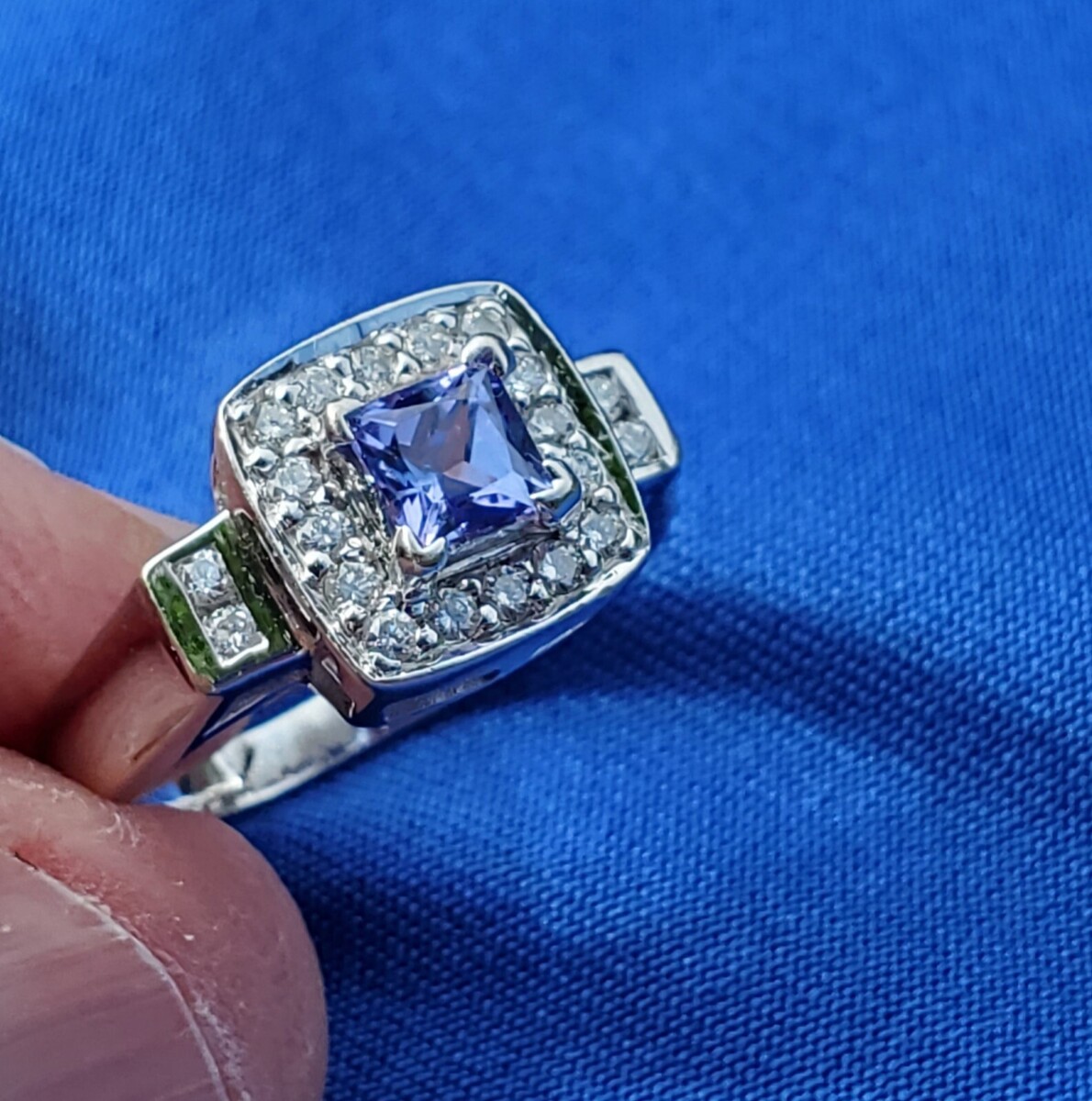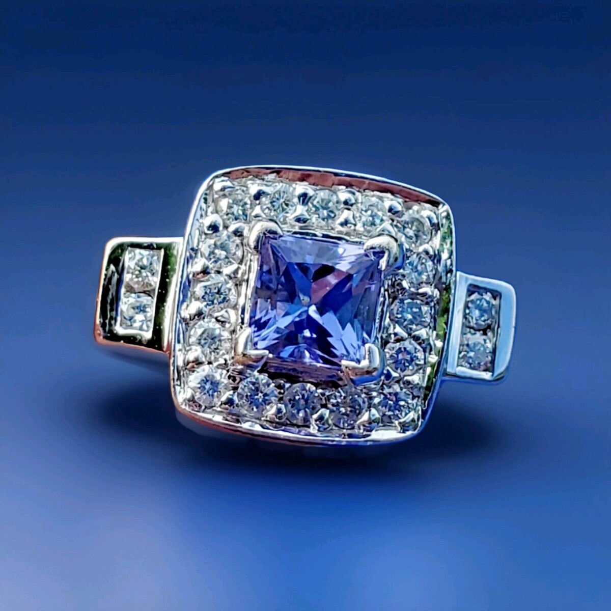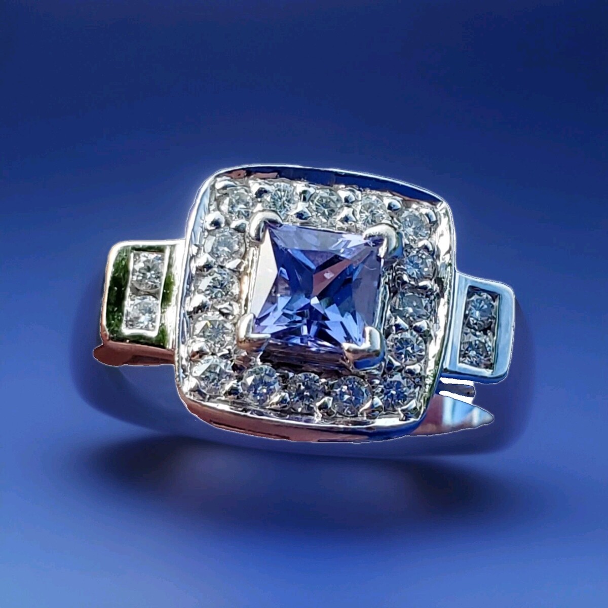 Natural princess cut tanzanite and pave set original halo flapper style diamonds ring.