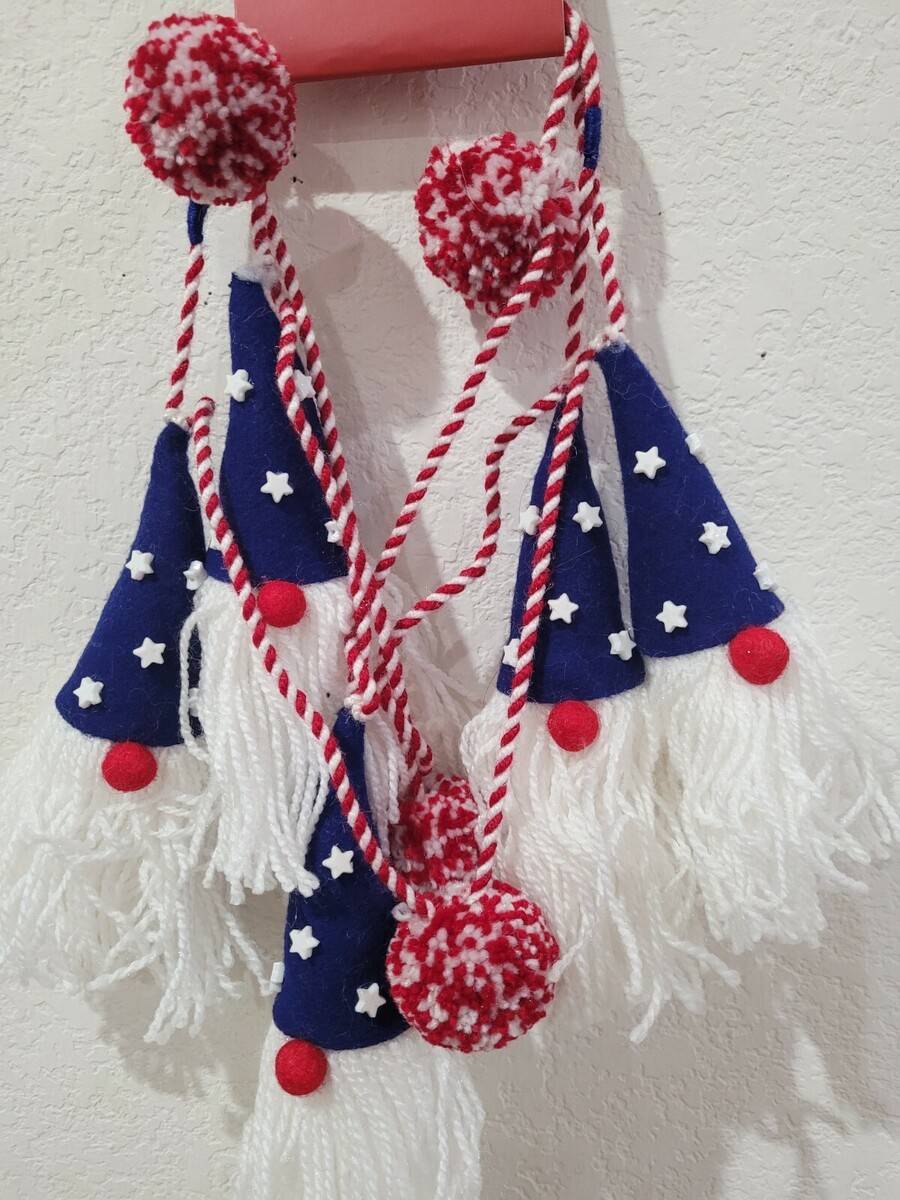 Up for sale we have this adorable gnome garland for your 4th of July decor. The gnomes are made of yarn and felt and have tiny white stars on the hat. Gnomes measure approx 6.75" tall and there are 8 gnomes on the strand. Garland is 6FT. New