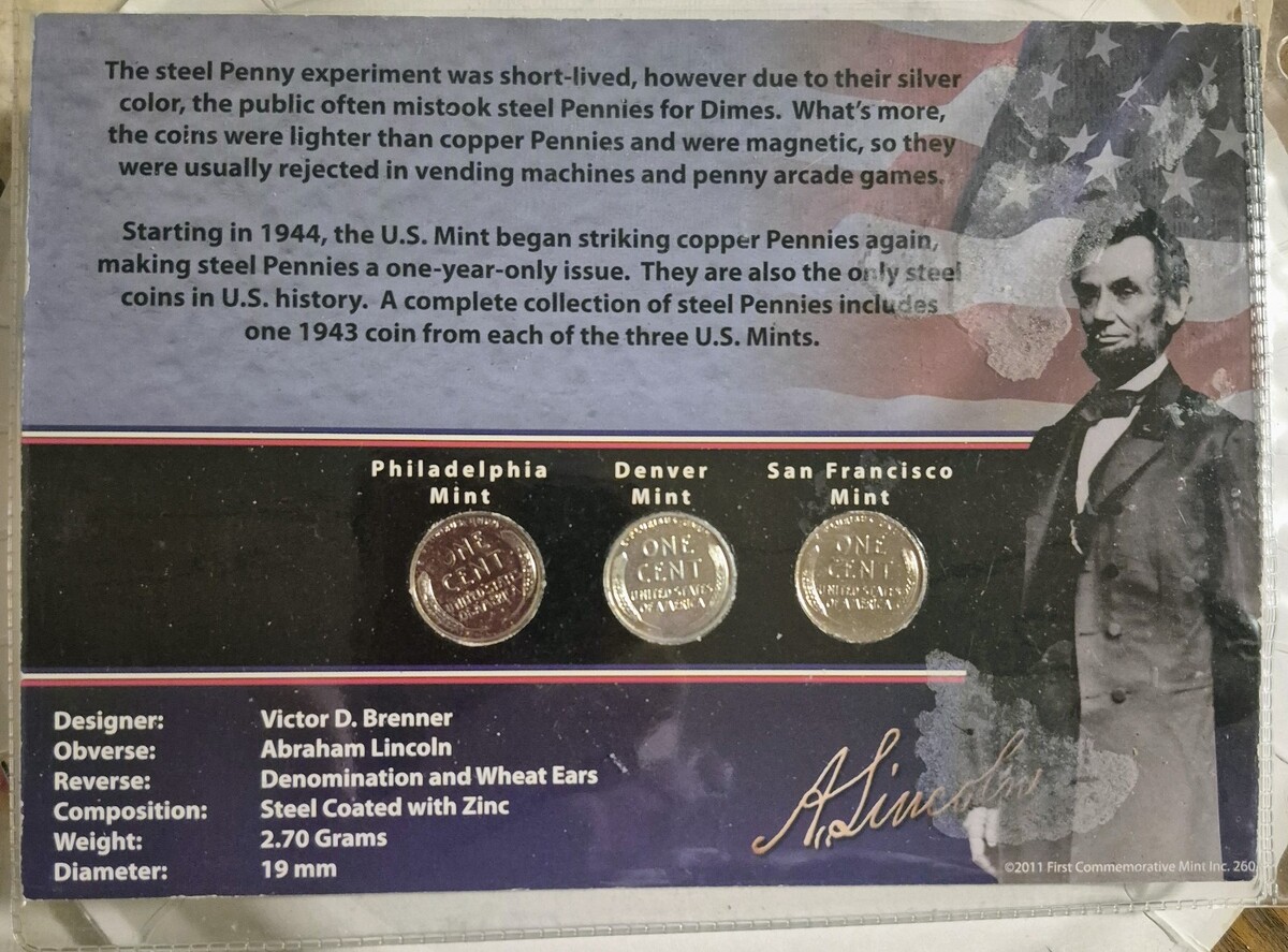 1943-D, P, & S 1C Lincoln Cent High grade lot of 3 Steel Pennies
