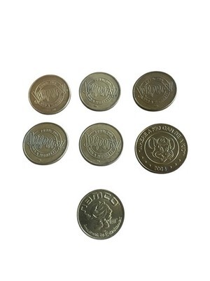 The product is a set of seven vintage 2000's Chuck E Cheese Jeepers NAMCO game coins tokens, featuring the Jeepers brand and originating from the United States in 2008. These original tokens are a piece of nostalgia from arcade gaming, perfect for collectors or enthusiasts of vintage arcade memorabilia. Each token likely holds sentimental value for those who remember playing games at Chuck E Cheese in the 2000's, showcasing the fun and excitement of childhood memories.