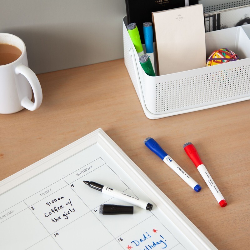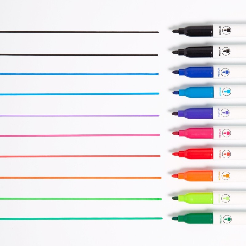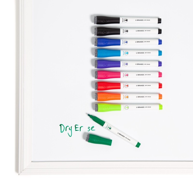 Write in style with U Brands Assorted 10 count Medium Bullet Tip Dry Erase Markers. These markers covers all your dry erase marker needs. The unique-colored ink dries quickly and erasing any mistake is easy with the built-in felt eraser on each marker cap. A contoured marker cap prevents markers from rolling off flat surfaces. The medium tip allows for a precise, smooth and bold laydown on boards both big and small. Compatible with any dry erase whiteboard or glass surface and perfect for any work, home or classroom environment. No need to sacrifice style with U Brands Dry Erase Markers.