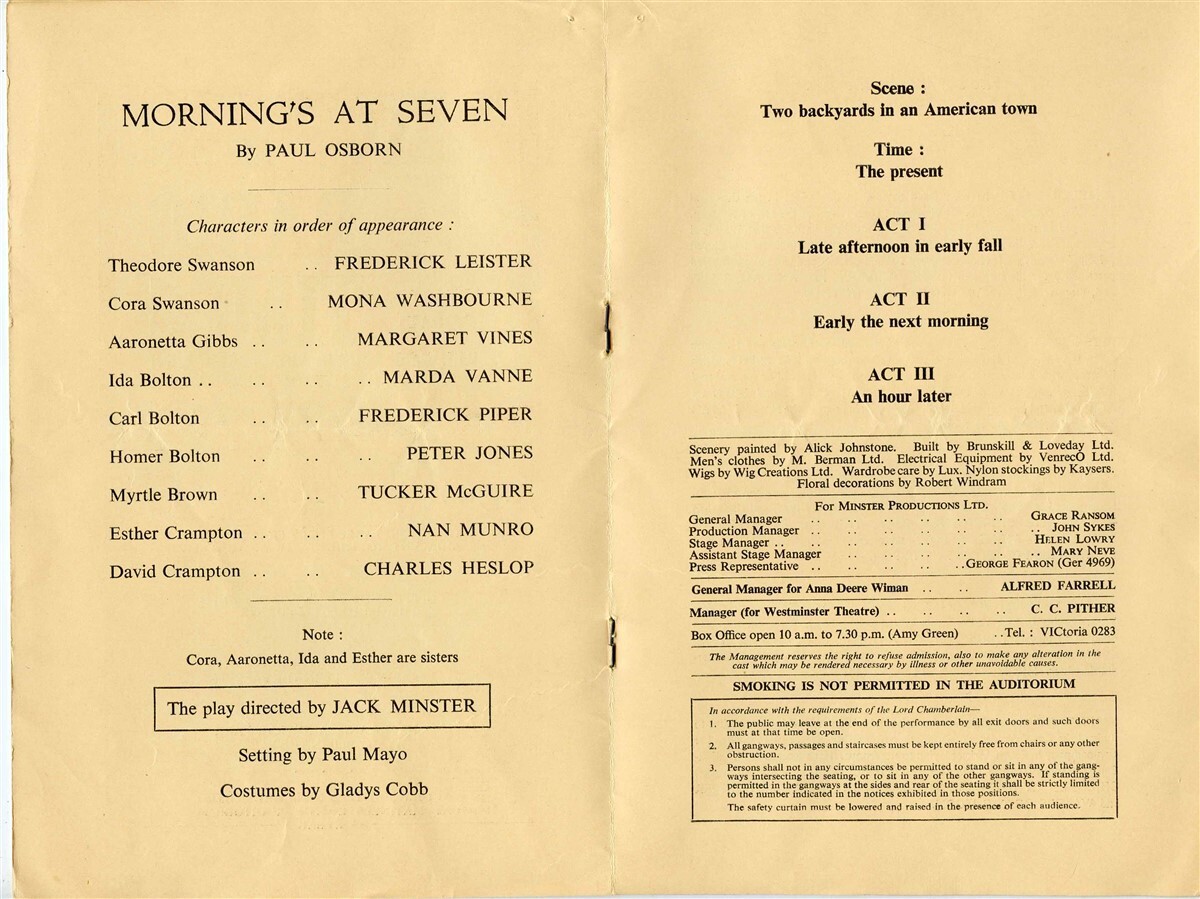 Morning's At Seven Program , from the Westminster Theatre in 1956 in London England . Starring Charles Heslop, Peter Jones and Frederick Leister