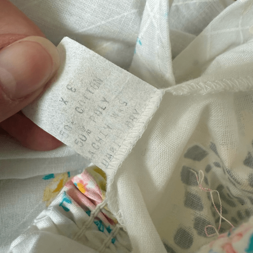 I?m not exactly sure if this 70s dress is in fact a dress or a nightgown. I know I had some dresses like this back in the day so I think it could be worn either way. Smocked top and shift style. cotton and polyester blend. That is the only information on the interior tag, no brand name or size, but it is featured on my size small dress form for scale. No noted flaws. Lay flat measures 9.5 inches armpit to armpit when relaxed stretching to 23 inches without much resistance, 24 inches straight across the waist and 28? across the hip.