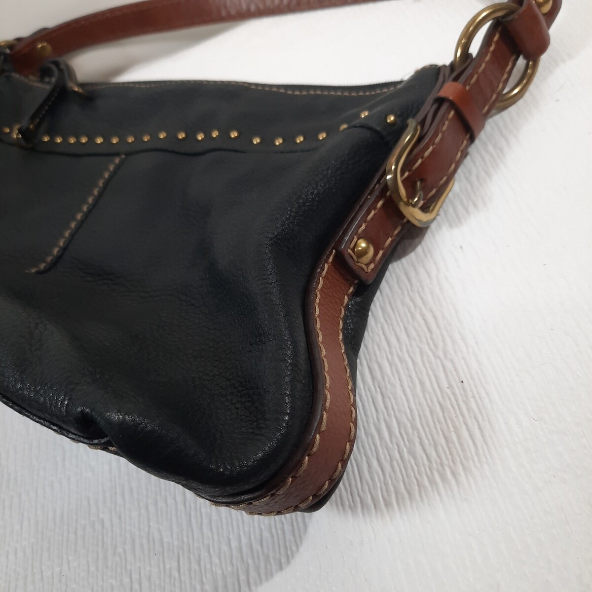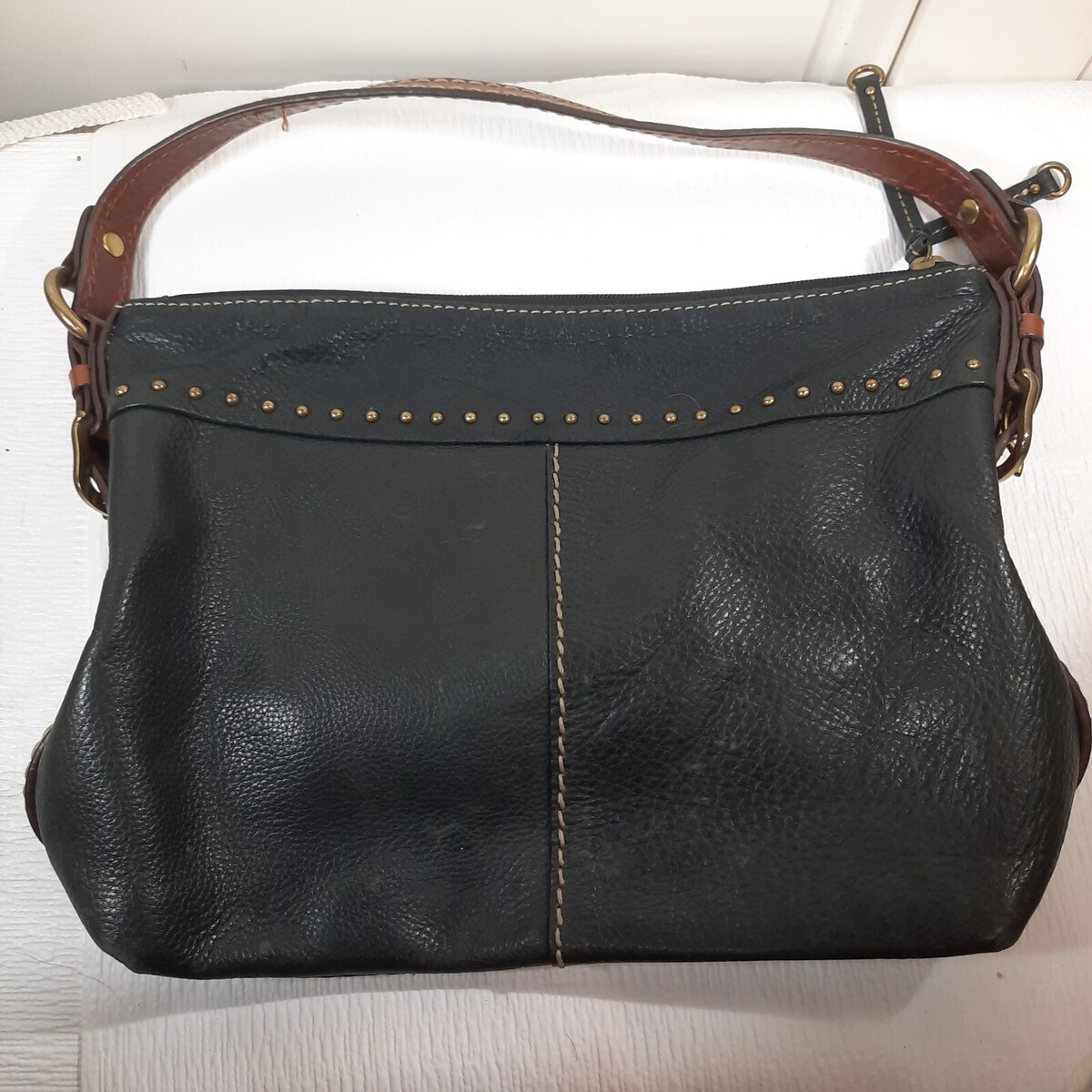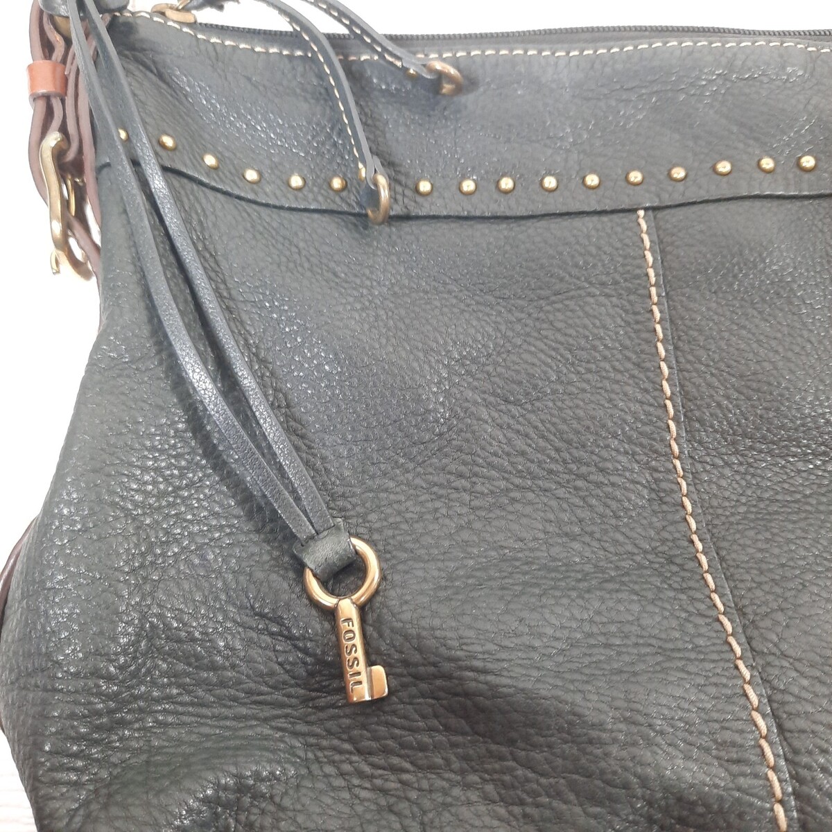 Vintage FOSSIL Black Purse Pebbled Leather Shoulder Bag Brown Handles 75082