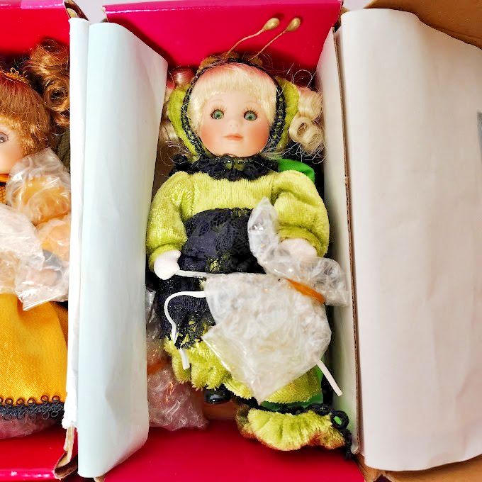 This listing is for a lot of four miniaturized porcelain dolls from the Marie Osmond Dolls collection. Each doll is part of the Bitty Beauty Bug series, measuring 6 inches in size. These collectible dolls feature bug characters and were parts of a subscription purchase from QVC. Perfect for doll collectors or display enthusiasts, these unique and charming dolls are sure to add a touch of nostalgia and whimsy to any collection. Their names are Queen Bee, Countess Caterpillar, Baroness Van Beatle, and Count Cocky Roach. Very cute dolls in very good condition. Boxes do have age and shelf wear. 3 Have certificates and necklaces. Cockey Roach does not have his. These are not toys are not recommended (per box) for children under age 6.