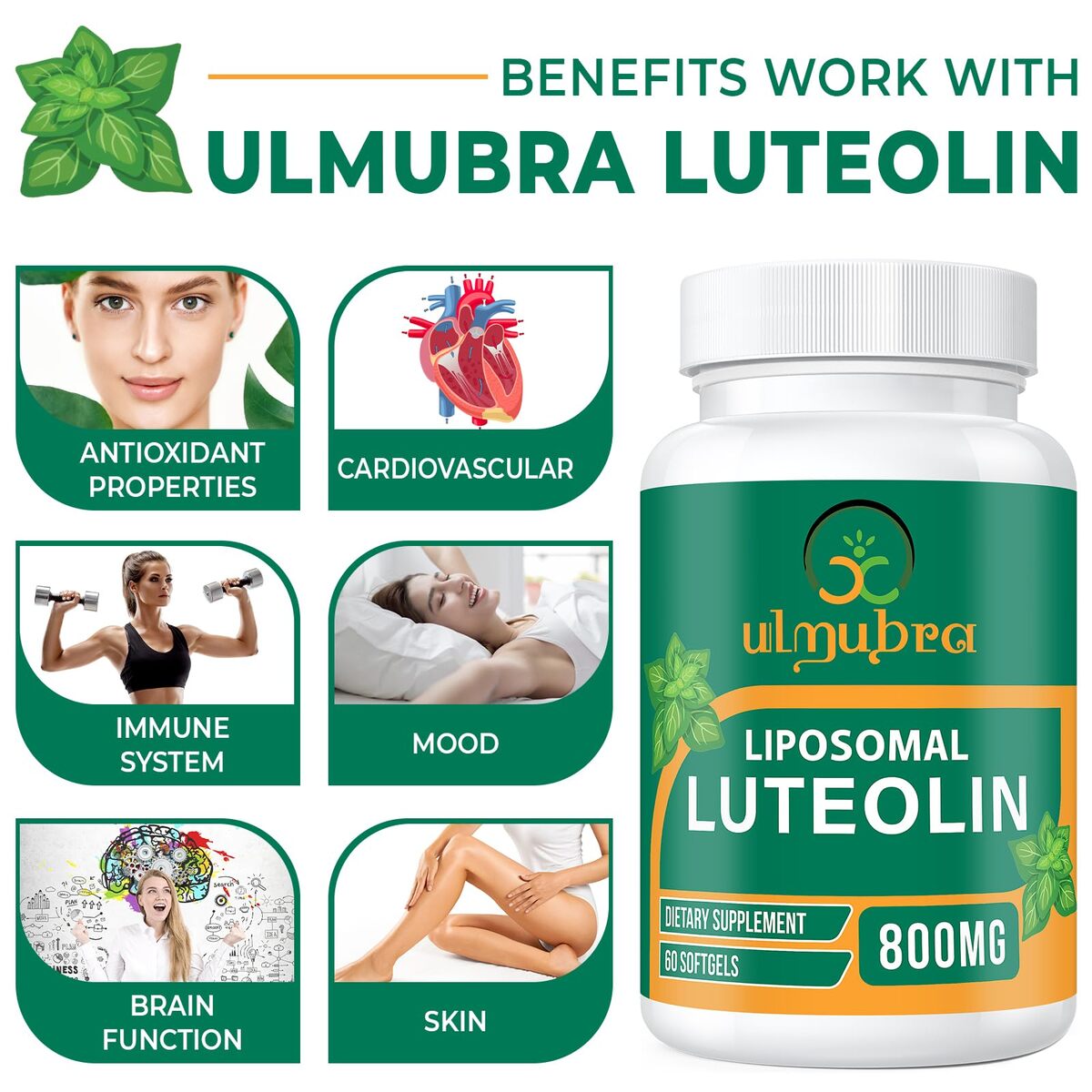 ??High Potency: Each serving of liposomal luteolin offers an impressive 800 MG dosage, providing a concentrated and powerful formula. This high-potency formulation ensures maximum effectiveness and optimal results. Each bottle contains 60 Softgels for a 30-day supply,??Enhanced Absorption: With liposomal technology, this luteolin supplement utilizes lipid-based nanoparticles to encapsulate the luteolin molecules to enhance its stability and protect it from degradation in the digestive system. This innovative delivery system enhances absorption and bioavailability, allowing for better utilization by the body.,??Comprehensive Benefits: Luteolin is a flavonoid known for its antioxidant properties, helping to combat harmful free radicals.,Premium Quality: Ulmubra takes pride in delivering top-notch quality supplements. We prioritize the use of all-natural materials in our product formulation. We believe in the power of nature and strive to provide you with a safe and effective supplement. Non-GMO, soy-free, gluten-free, dairy-free, chemicals-free, and artificial preservatives -free. Manufactured in the USA.,??Easy to Swallow: We understand the challenges of swallowing larger capsules. With our product, you can say goodbye to that worry. Our easy-to-swallow capsules are specially designed to make your daily luteolin intake a breeze.
