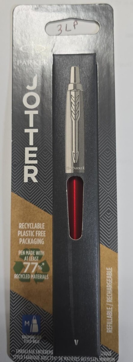 Write letters, memos, and various other notes with this blue retractable ballpoint pen. The pocket clip allows for convenient portability, so you can always be prepared wherever you go, while the retractable feature hides the pen tip when not in use, protecting papers and clothing from unintended marks. This Parker Jotter retractable ballpoint pen features a silver and red body, producing a professional, sleek appearance that's ideal for office environments.