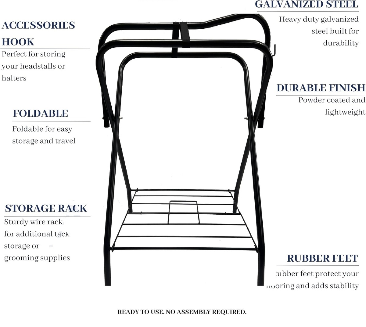 Portable free-standing saddle rack features nylon straps for proper saddle fitting, a fold out shelf underneath, and a bridle hook. Scissor design folds flat for portability and storage.