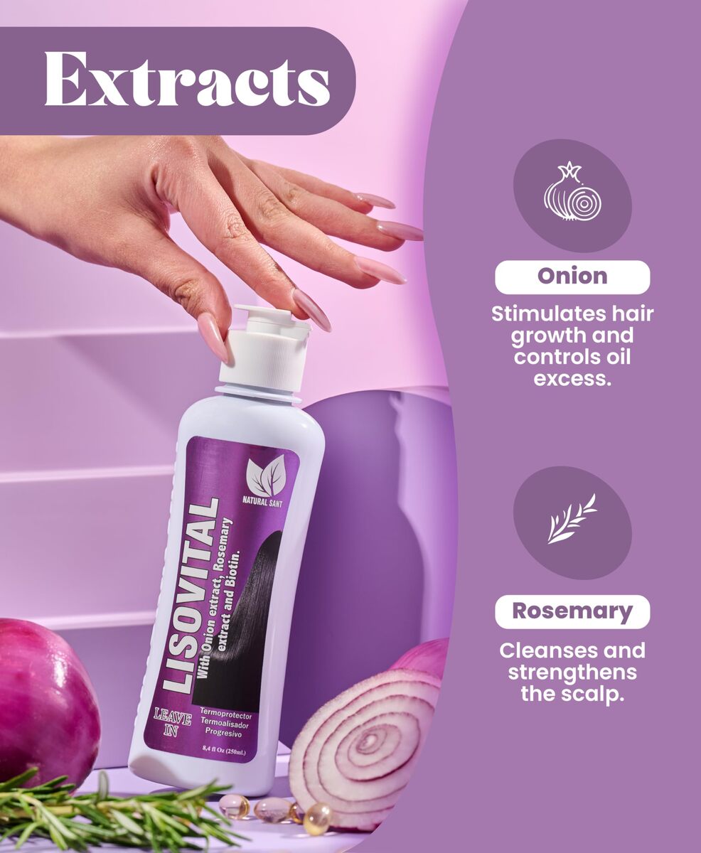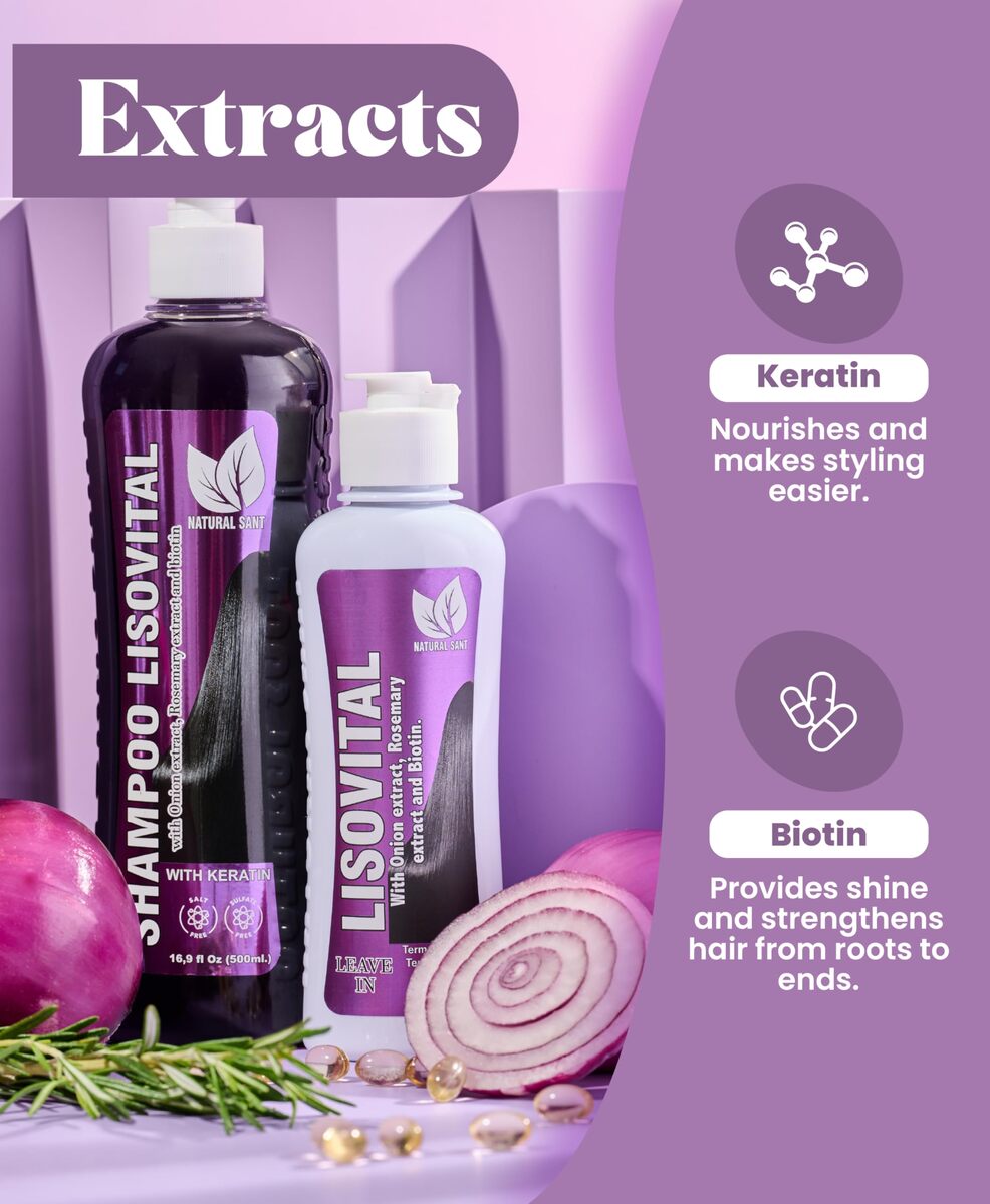 LISOVITAL Shampoo and Leave-in treatment set: A complete hair care solution designed for routine shampoo and leave in for women hair loss and frizz control, our dual-action formula combines keratin with natural shampoo ingredients like red onion extract, rosemary, and biotin. It effectively controls frizz, restores shine, and helps to promote hair growth.,Advanced heat protection for styling: As part of hair growth products, LISOVITAL Leave-in acts as a heat protectant, safeguarding your hair from styling tools while preventing breakage. Our LISOVITAL set of shampoo and leave-in softens, detangles, and ensures a sleek, salon-quality finish every time.,Contains Onion, Rosemary and Biotin for healthy hair growth: Enriched with biotin for hair growth women, rosemary, and onion extract. LISOVITAL?S natural formula deeply nourishes and strengthens your hair. Ideal for promoting hair growth, shampoo benefits while keeping your hair strands smooth, shiny, and resilient.,Effortless application for stunning results: Wash your hair with LISOVITAL shampoo, then apply LISOVITAL as a leave-in treatment. No need for additional products! Achieve a flawless, straightened look with anti-frizz control that?s perfect for everyday styling.,Versatile hair growth and restoration formula: Whether you?re battling hair loss or simply want healthier hair, LISOVITAL?s nutrient-rich blend of keratin, biotin, and natural extracts makes it the ultimate solution for all hair types. Perfect for Onion, Rosemary and Biotin Set users seeking hydration, progressive straightening, and long-lasting protection.