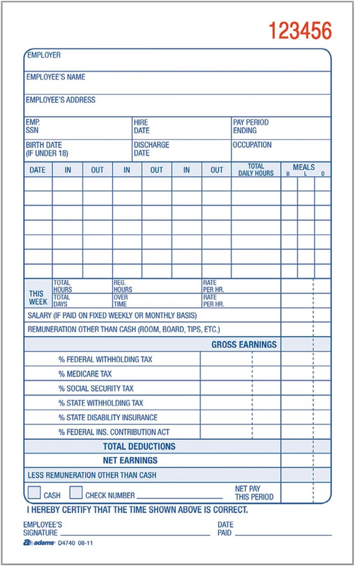 Adams Business Forms provide the tools to help keep track of messages, finances, transactions, employees, taxes, and customers to businesses throughout the world. These products are the perfect way to create and maintain a professional image for small businesses and service providers. The Adams D4740 Employee Payroll Record Book has everything you need to account for your employees' compensation. This versatile book measures 4.19 x 7.19 inches and tracks hours worked, gross earnings, deductions and net pay. Each 2 part carbonless forms set is consecutively numbered and features a white/canary paper sequence, with 50 sets in each book. Whether it's a multi-part form, notebooks, writing pads, record books, or any of the hundreds of items we offer, you can count on Adams products to help.