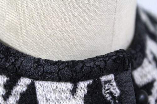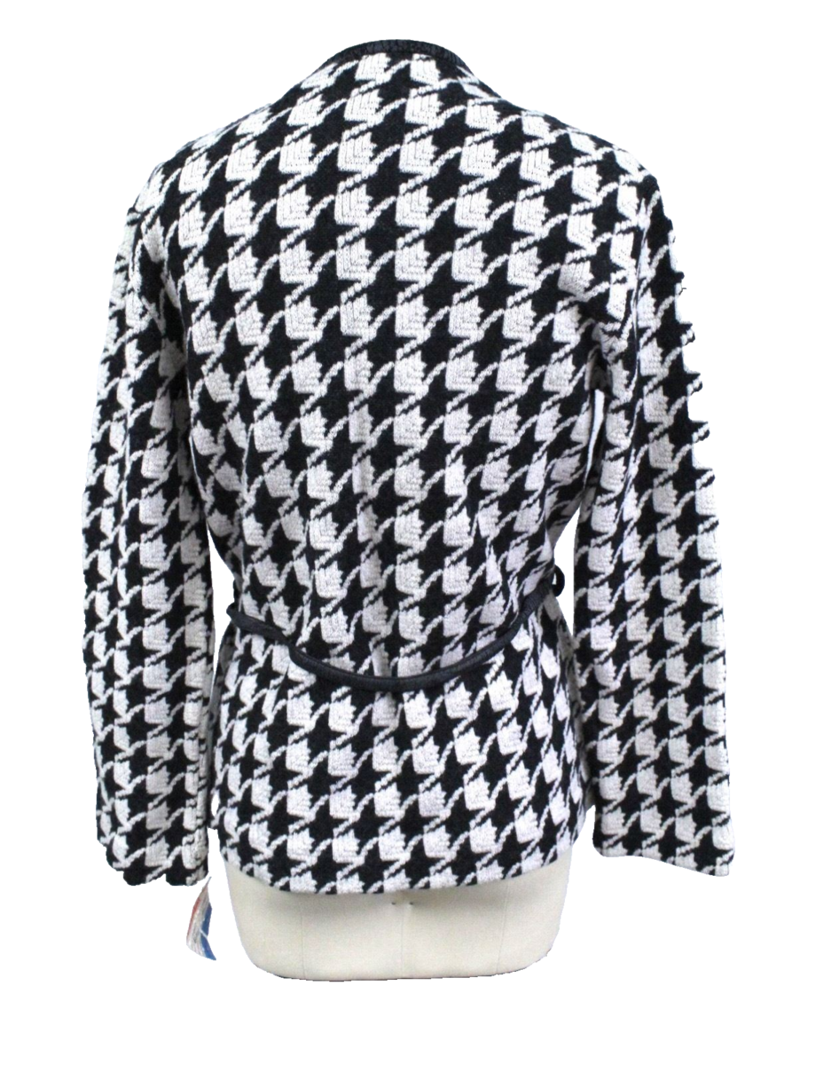 An iconic piece of mid-century fashion history, this vintage Jantzen jacket-sweater features a bold black and white houndstooth pattern that is both classic and mod. The button-front design is complemented by a matching belt, and it's an incredible find with its original tags still attached. The jacket is in excellent condition, with the exception of the "pleather" trim and belt, which have begun to peel?a common occurrence for materials of this age, which adds to its authentic vintage character. Despite this one flaw, the wool blend fabric is pristine. Owning this New Old Stock piece is a unique, sustainable choice, giving a brand-new, decades-old garment its first life.