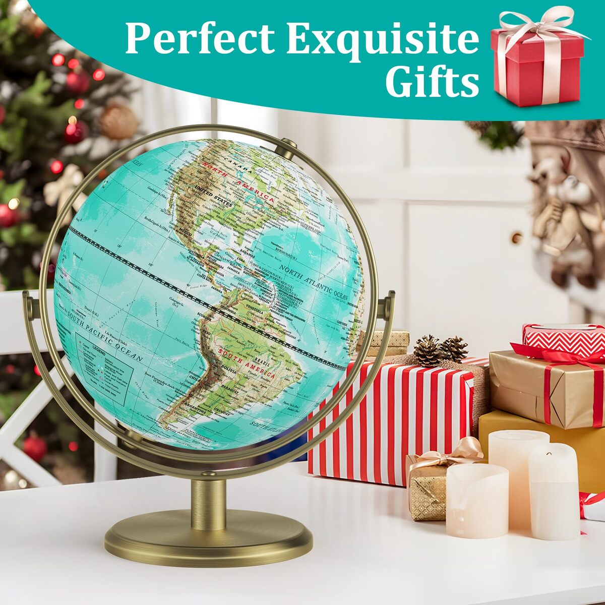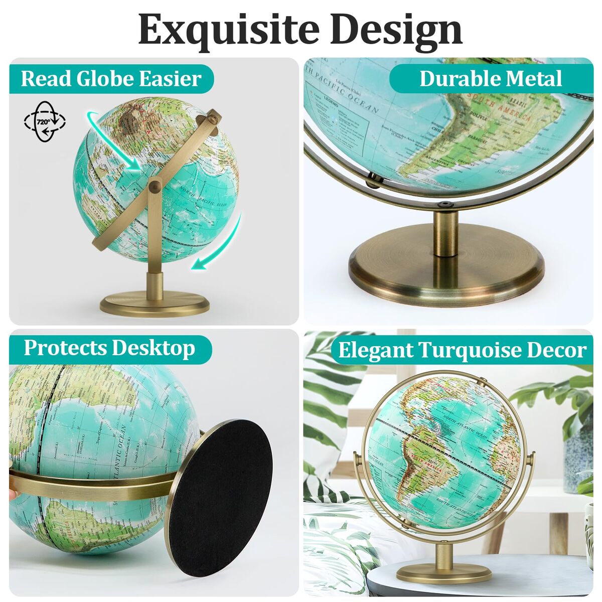 8-inch Elegant Globe: Desktop globe has a modern and fashionable design, with noble tiffany blue globe and the luxurious gold stand perfect match, good idea for home/office decoration, also children geography educational globe. A great item to own and give as a gift.,Stable 720 Spinning Stand: Metal stand rotates in all angles (Up-down, left-right, front-back) and swivels very well without wobbly and isn?t easy to break or damage. You can turn any face towards you. A bit like viewing earth from space. Easily and clearly see any spot on the planet.,Premium Standard Globe: Current earth map globe , detailed and accurate. High-definition print, text is clear and easy to read. Taking into account both appearance and functionality. [JOWHOL BRAND AFTER-SALES]: Our 7*24 friendly customer service gives you peace of mind.,Educational Decoration: The World Globe is a nice learning tool for students and adults in Geography learning. Interactive globe planning your intercontinental voyages. Decorative globe fit all styles, retro, luxury, modern, and minimalist. Gold table decor.,Perfect Gifts: Earth globe that people of all ages will love. Kids Learning Education Teaching Toys, Home /Office /Desktop/ display case/ display stand decoration, business gifts for boss, great gifts for family, friends, child, student, colleagues. Creative Gifts idea for Birthday, Anniversary, Valentine's day,Children's Day, Father's Days, Thanksgiving Day, Christmas, New Year.