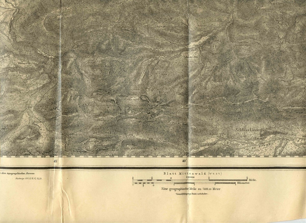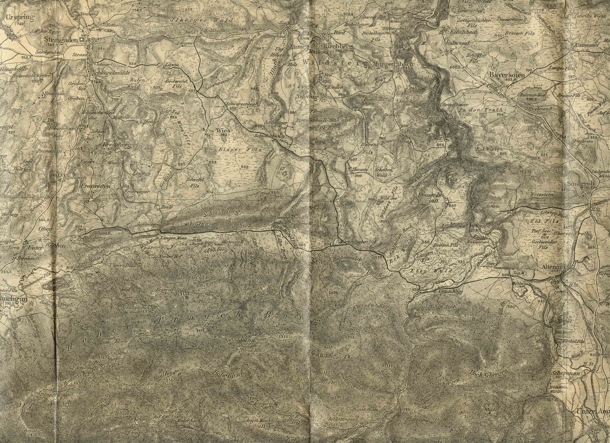 A large single page map with blank back. Opens to about 24" x 18 1/2". Murnau West 1903 Map in German