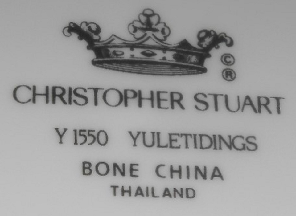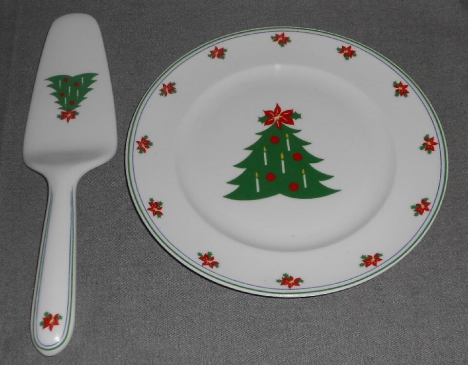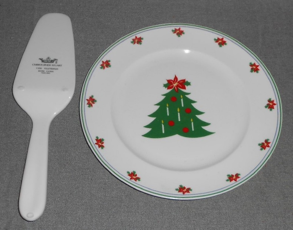 This is a two piece Bone China Christmas Cake Set from Christopher Stuart in the Yuletidings Pattern. The plate measures approx. 8 1/2" and the Cake/Pie Server measures approx. 10 1/2" and both are in good pre-owned condition with no chips or damage.